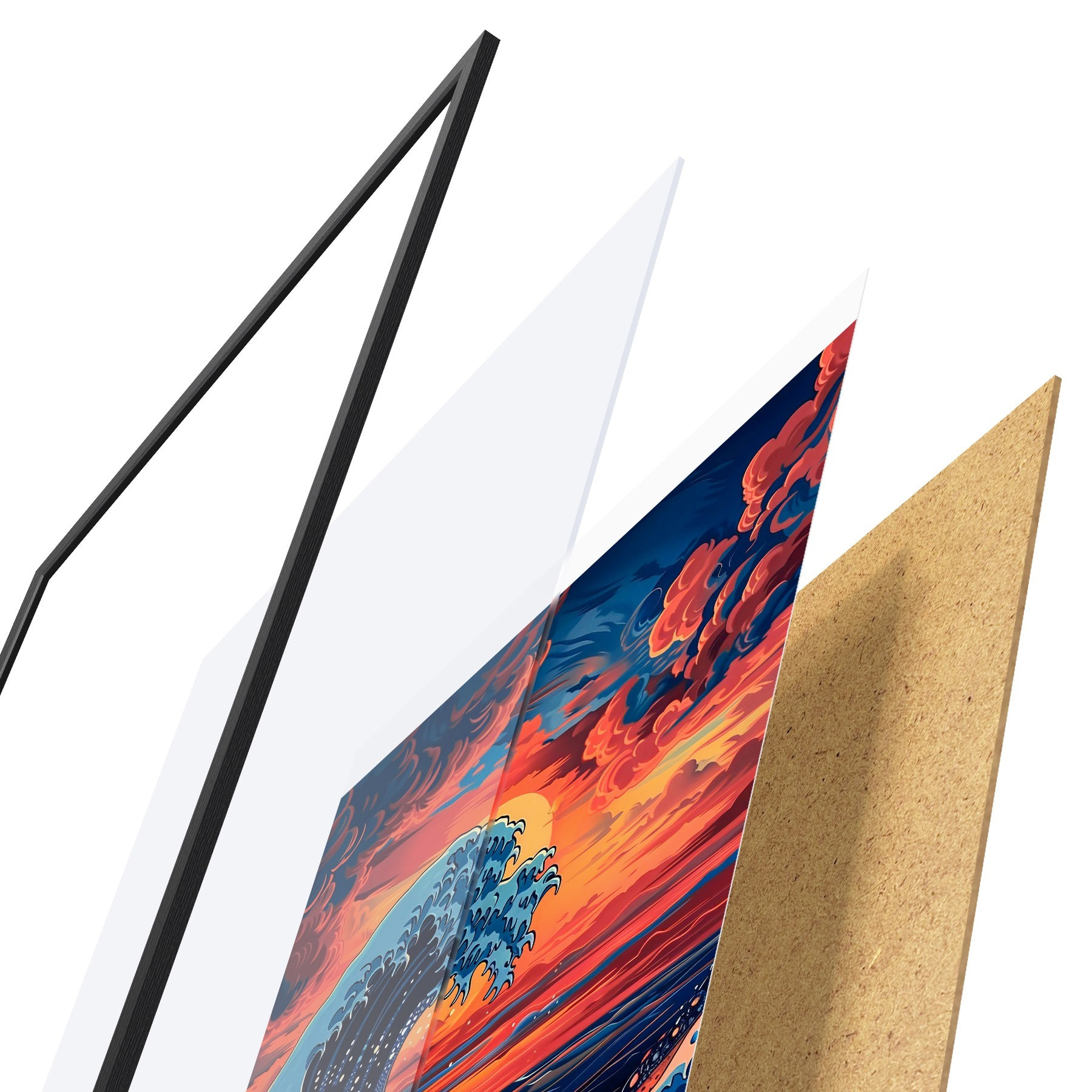Plakatą sudaro rėmas, pleksiklas, atspausdintas vaizdas ir medžio drožlių plokštės pagrindas. Plakatą galima iš karto pakabinti ant sienos dėl kitoje pusėje esančių laikiklių.