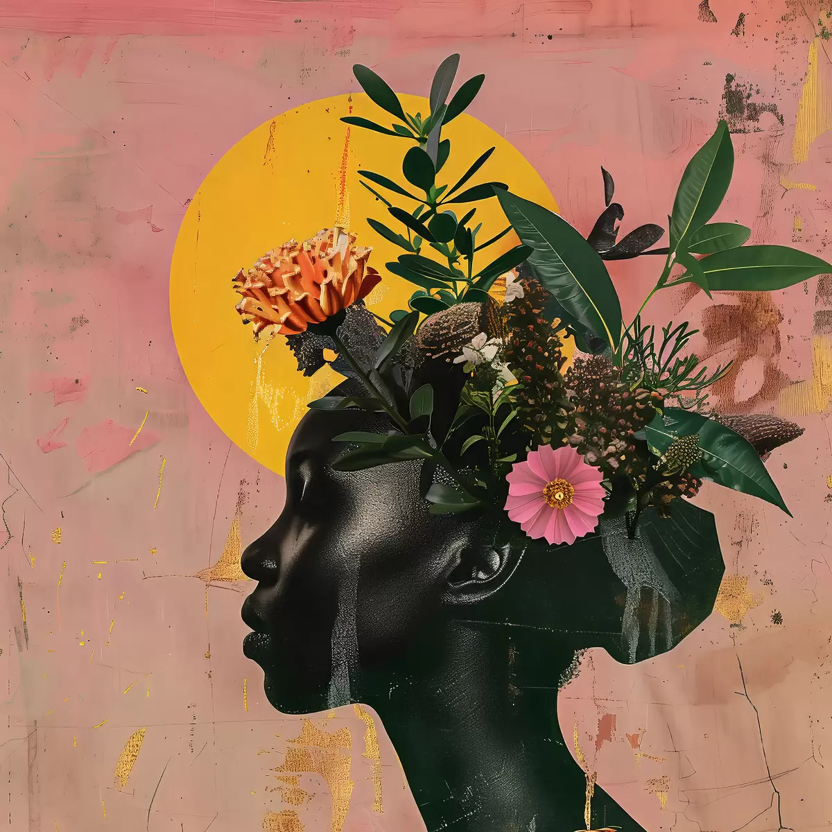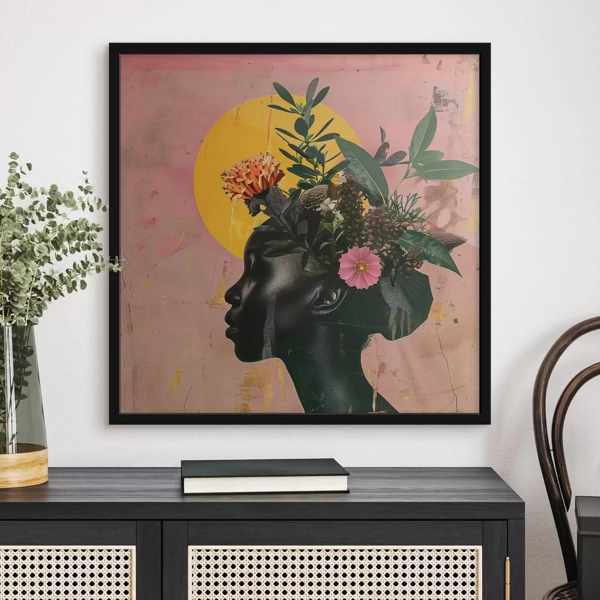 Plakatas Mergina su gėlėmis ir lapais ant galvos f39049