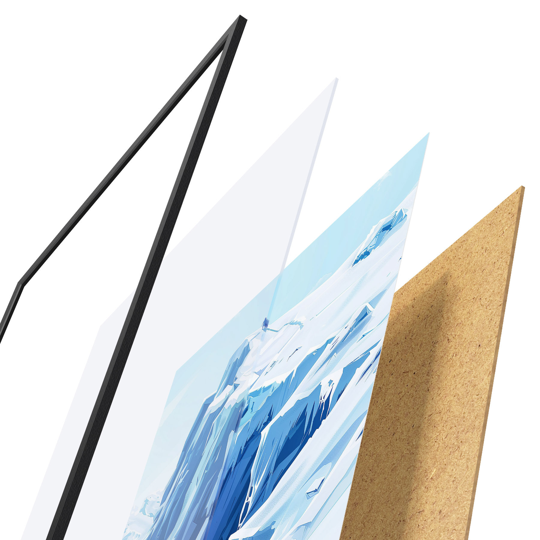 Plakatą sudaro rėmas, pleksiklas, atspausdintas vaizdas ir medžio drožlių plokštės pagrindas. Plakatą galima iš karto pakabinti ant sienos dėl kitoje pusėje esančių laikiklių.