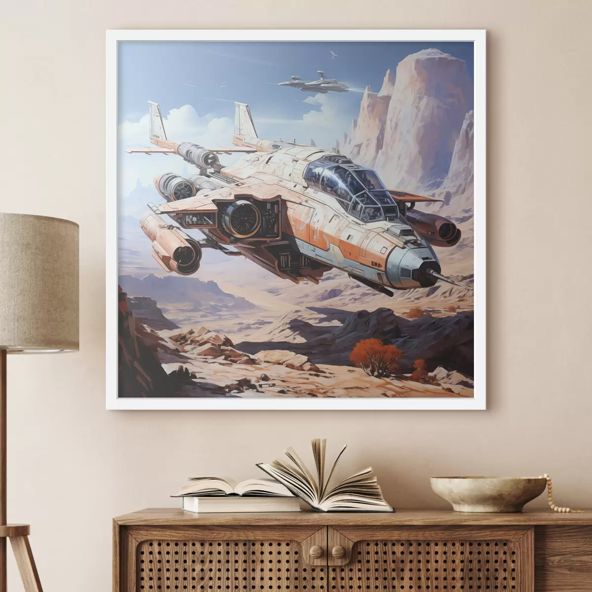 Plakatas Kiberpanko stiliaus erdvėlaivis skrenda tarp kalnų ir debesų, Mėnulio kraštovaizdžio, mėlynos, smėlio, baltos spalvos Ne f39113