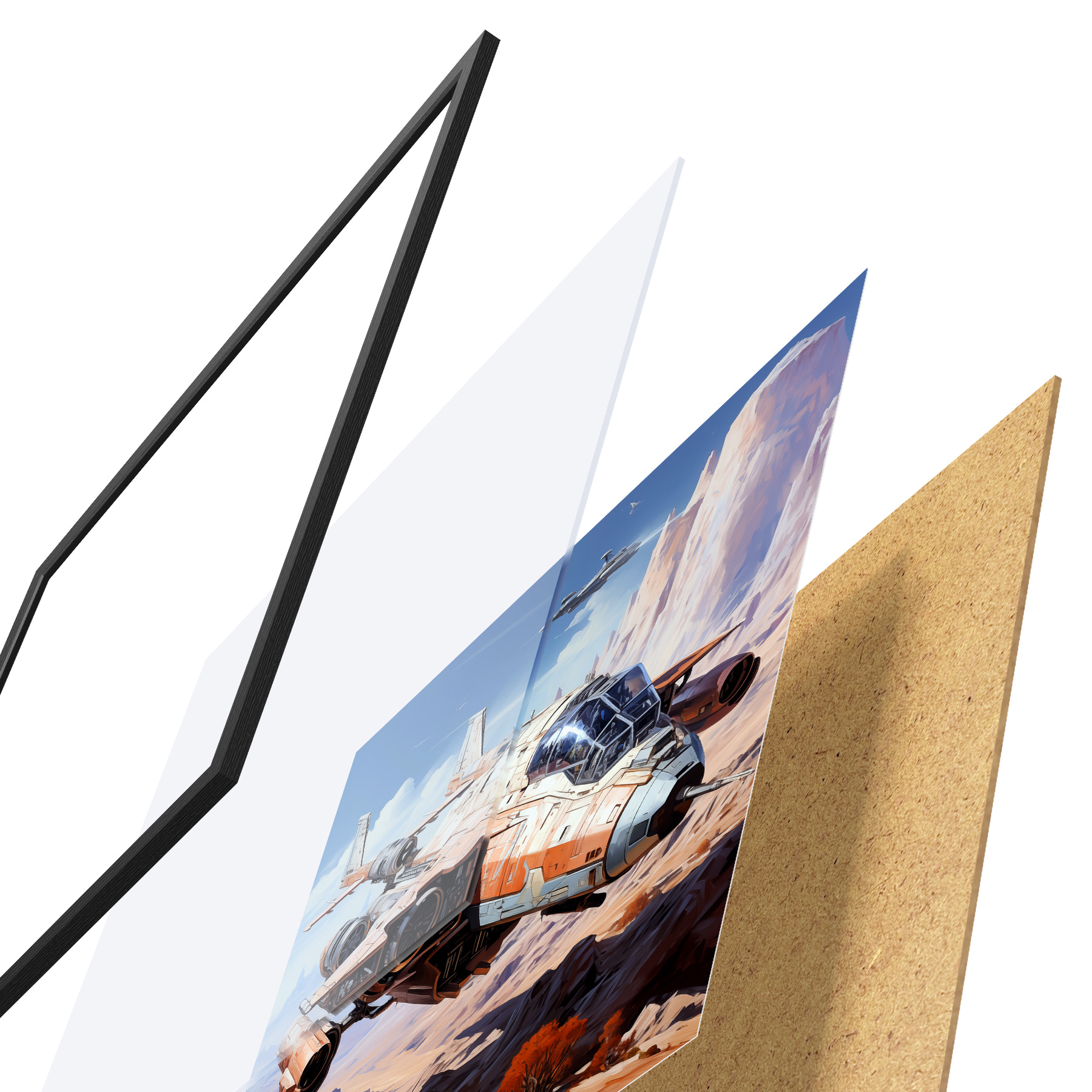 Plakatą sudaro rėmas, pleksiklas, atspausdintas vaizdas ir medžio drožlių plokštės pagrindas. Plakatą galima iš karto pakabinti ant sienos dėl kitoje pusėje esančių laikiklių.
