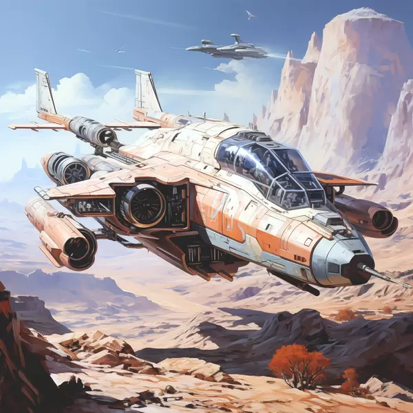 Plakatas Kiberpanko stiliaus erdvėlaivis skrenda tarp kalnų ir debesų, Mėnulio kraštovaizdžio, mėlynos, smėlio, baltos spalvos Ne f39113