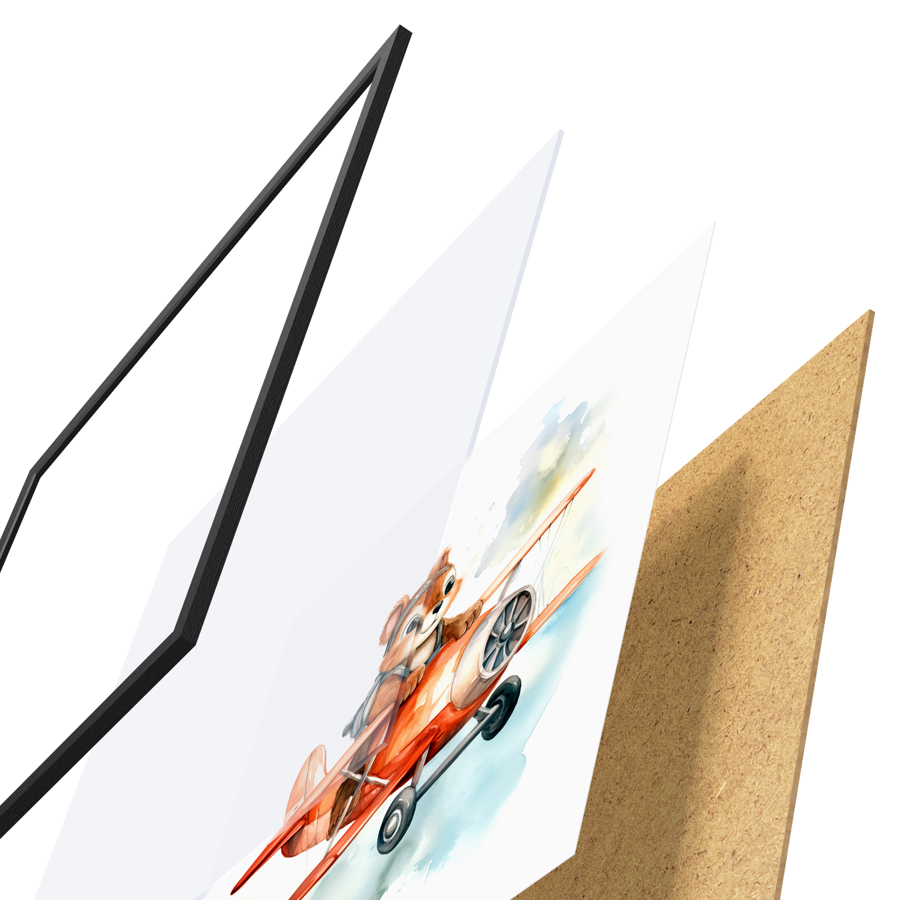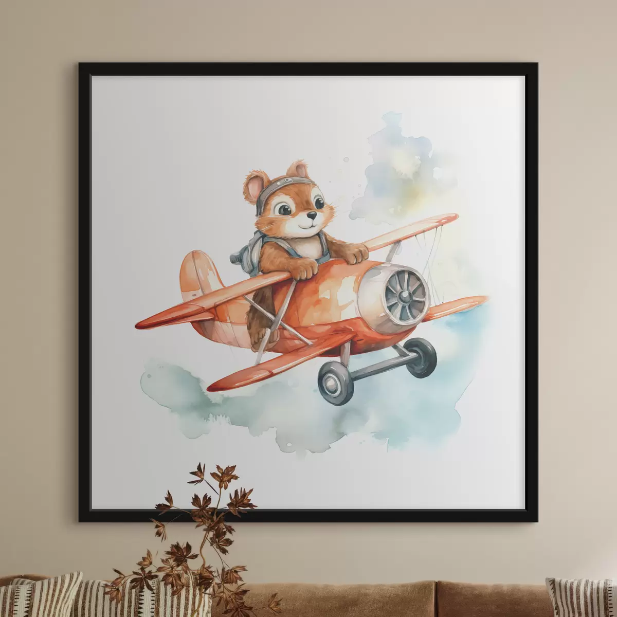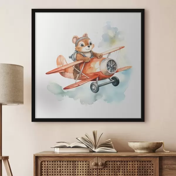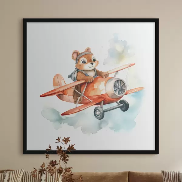 Plakatas Maža voverytė skrenda akvarelinėje vaikiškoje raudono lėktuvo iliustracijoje Ne f39116