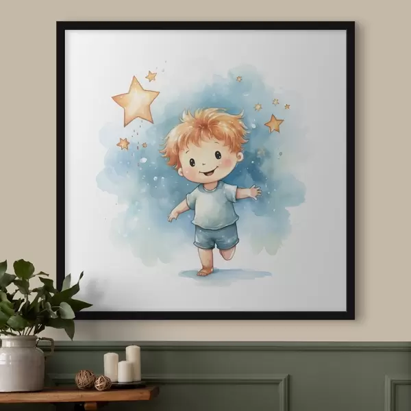 Plakatas Raudonplaukis berniukas mėlynu kostiumu bėga paskui žvaigždes, akvarelinė iliustracija vaikams f39118