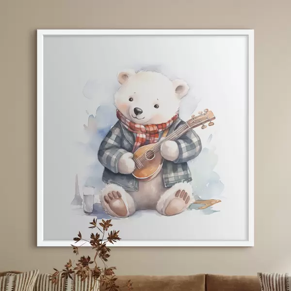 Plakatas Mėlynu languotu kostiumu ir raudonu šaliku vilkintis baltasis lokys muzikantas groja gitara akvarelinė iliustracija vaikams f39120