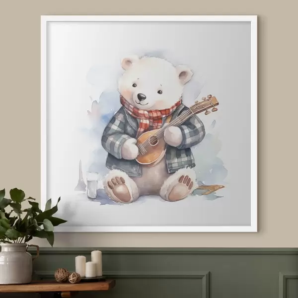 Plakatas Mėlynu languotu kostiumu ir raudonu šaliku vilkintis baltasis lokys muzikantas groja gitara akvarelinė iliustracija vaikams Ne f39120