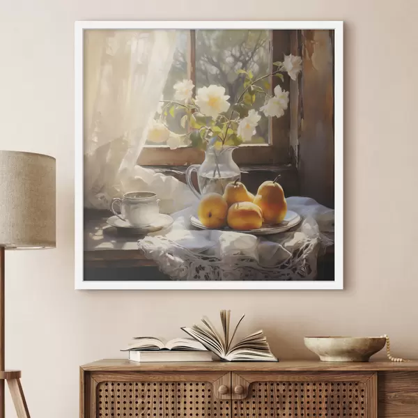 Plakatas Kaimiškas natiurmortas su geltonomis prinokusiomis kriaušėmis lėkštėje ant stalo prie lango, baltomis rožėmis stikliniame ąsotyje, baltomis nėriniuotomis užuolaidomis f39129