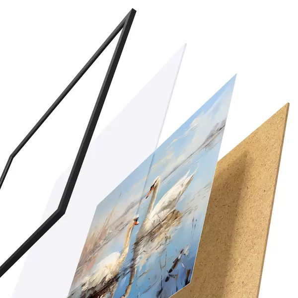 Plakatą sudaro rėmas, pleksiklas, atspausdintas vaizdas ir medžio drožlių plokštės pagrindas. Plakatą galima iš karto pakabinti ant sienos dėl kitoje pusėje esančių laikiklių.