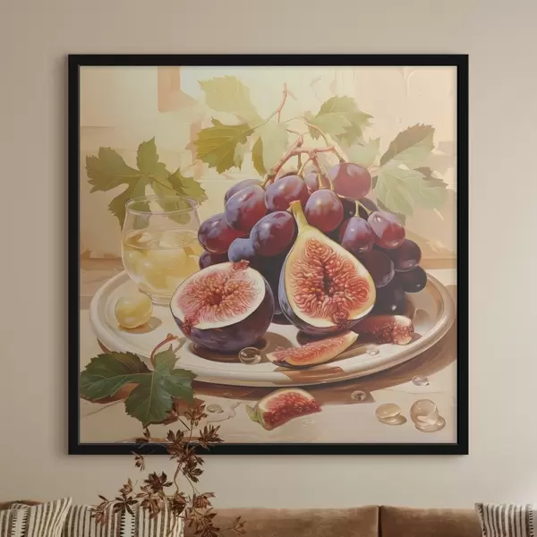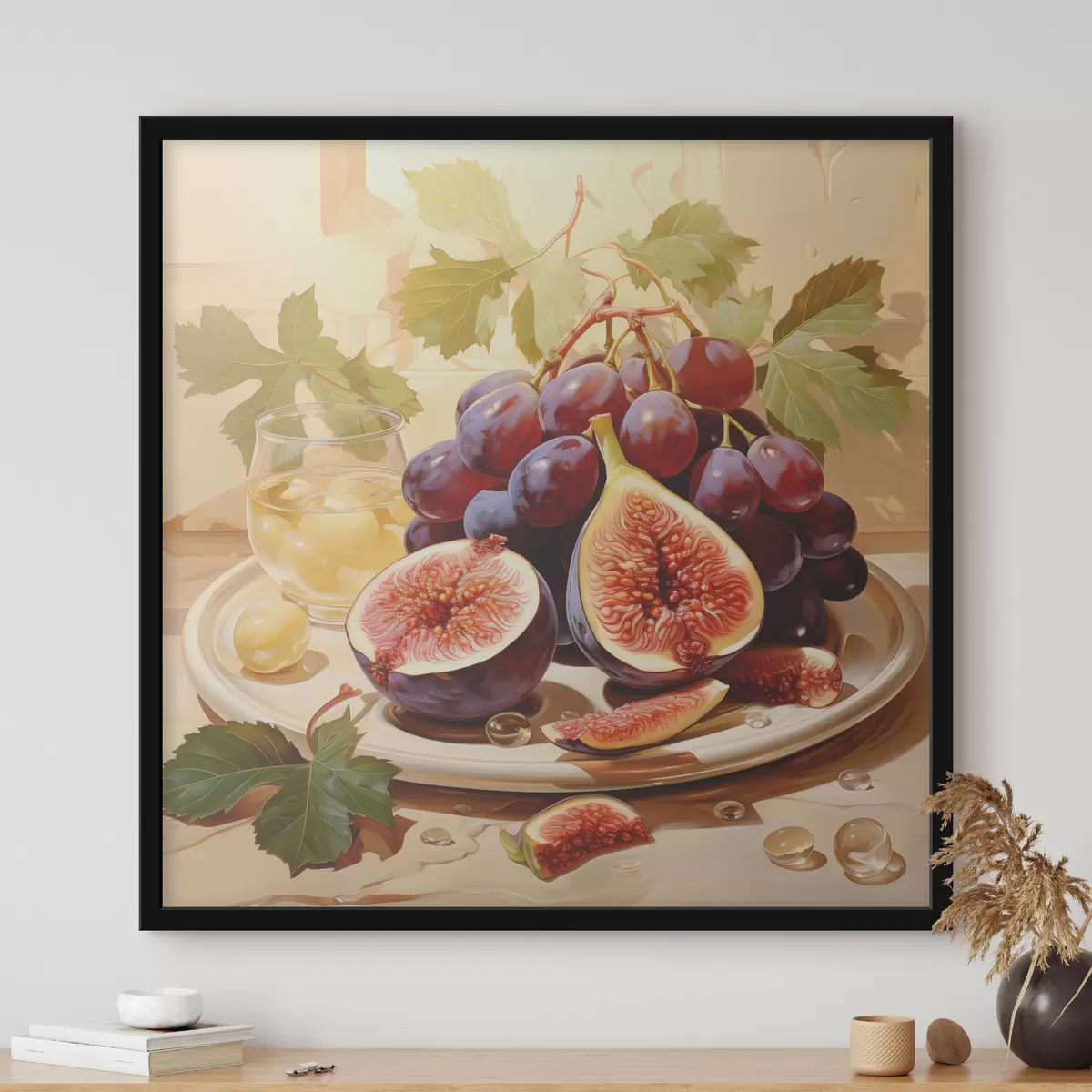 Plakatas Natiurmortas su mėlynomis vynuogėmis ir pjaustytomis figomis ant aliejinės tapybos lentos, smėlio ir rausvos spalvos f39131
