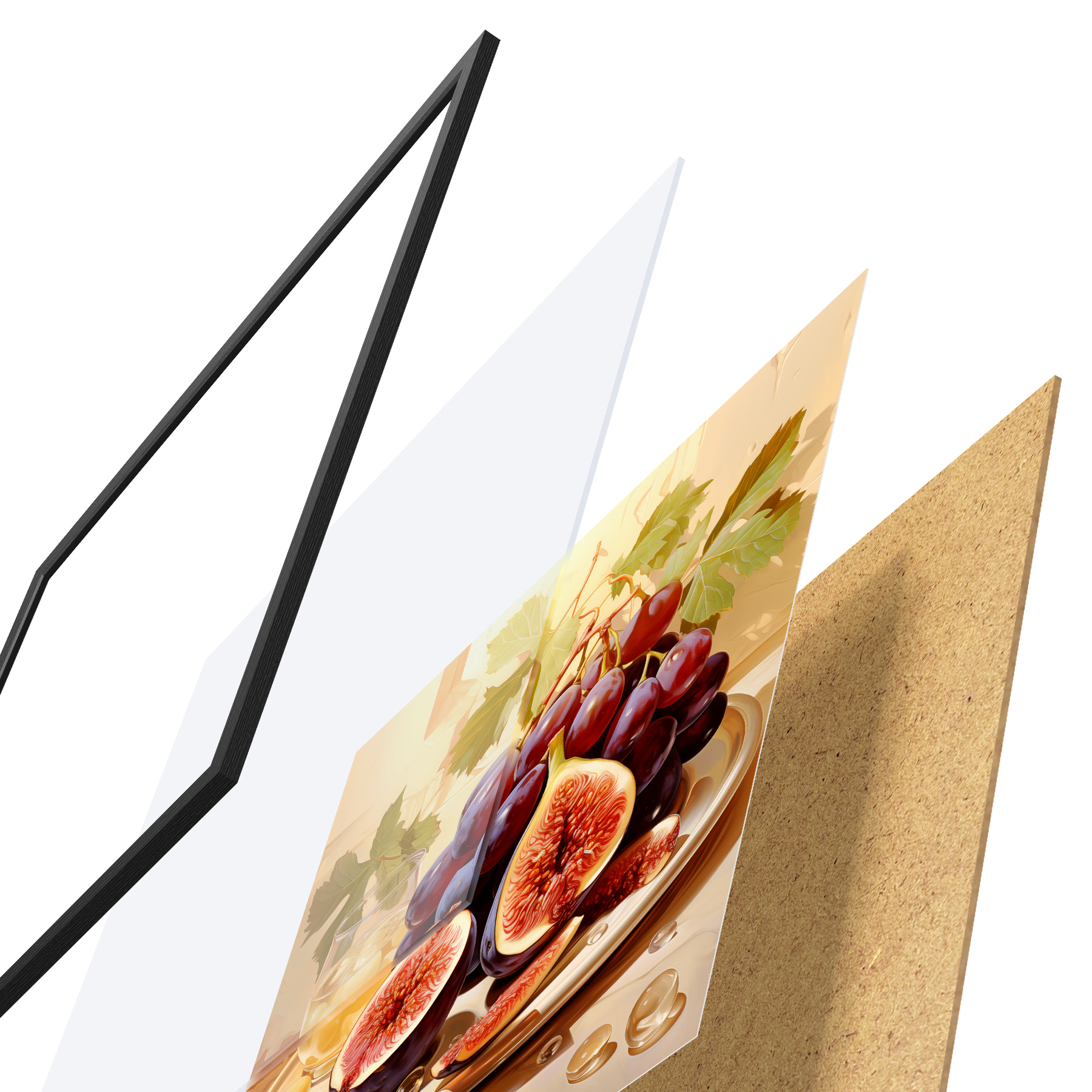 Plakatas Natiurmortas su mėlynomis vynuogėmis ir pjaustytomis figomis ant aliejinės tapybos lentos, smėlio ir rausvos spalvos Ne f39131