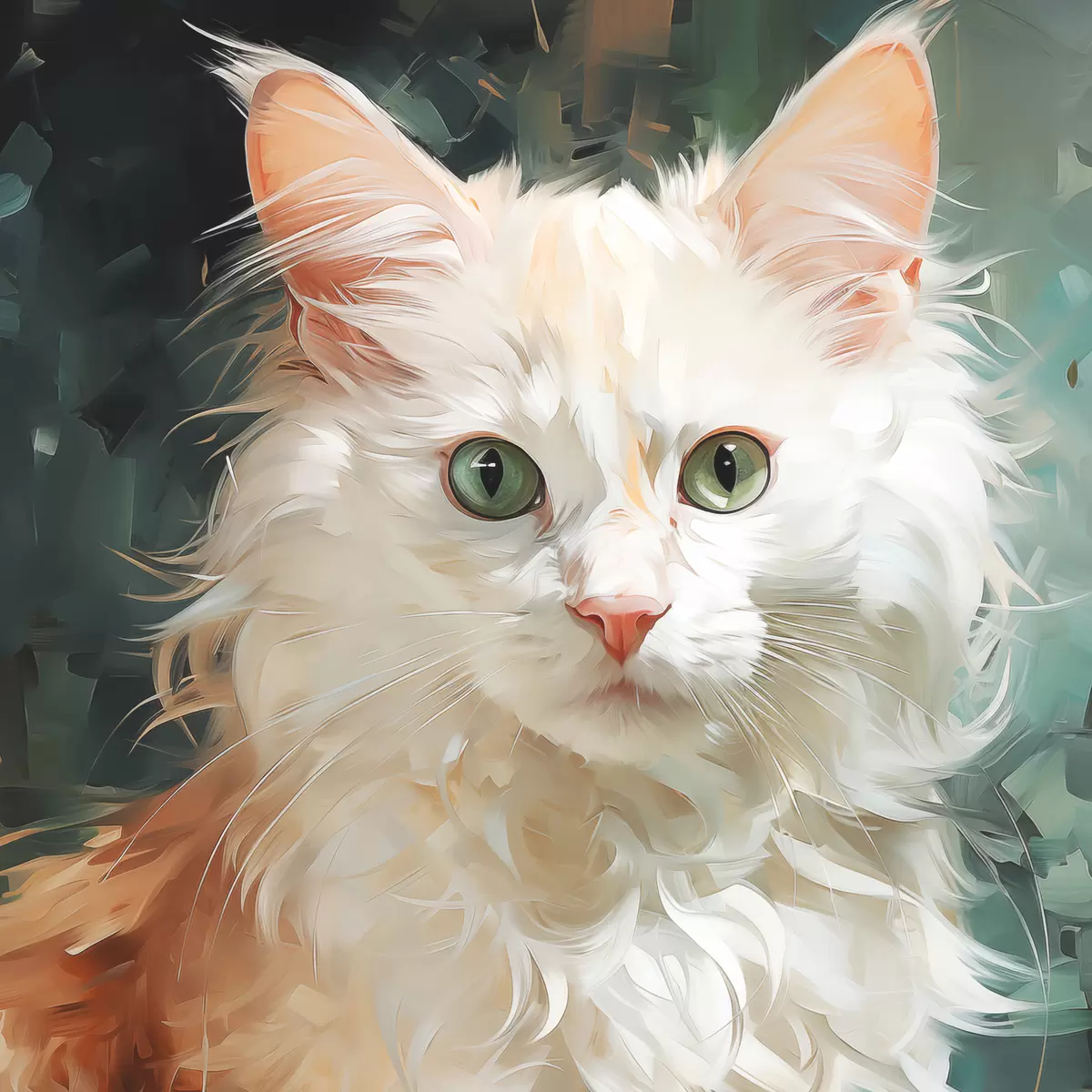 Plakatas Balta pūkuota katė žaliomis akimis žaliame portreto fone f39132