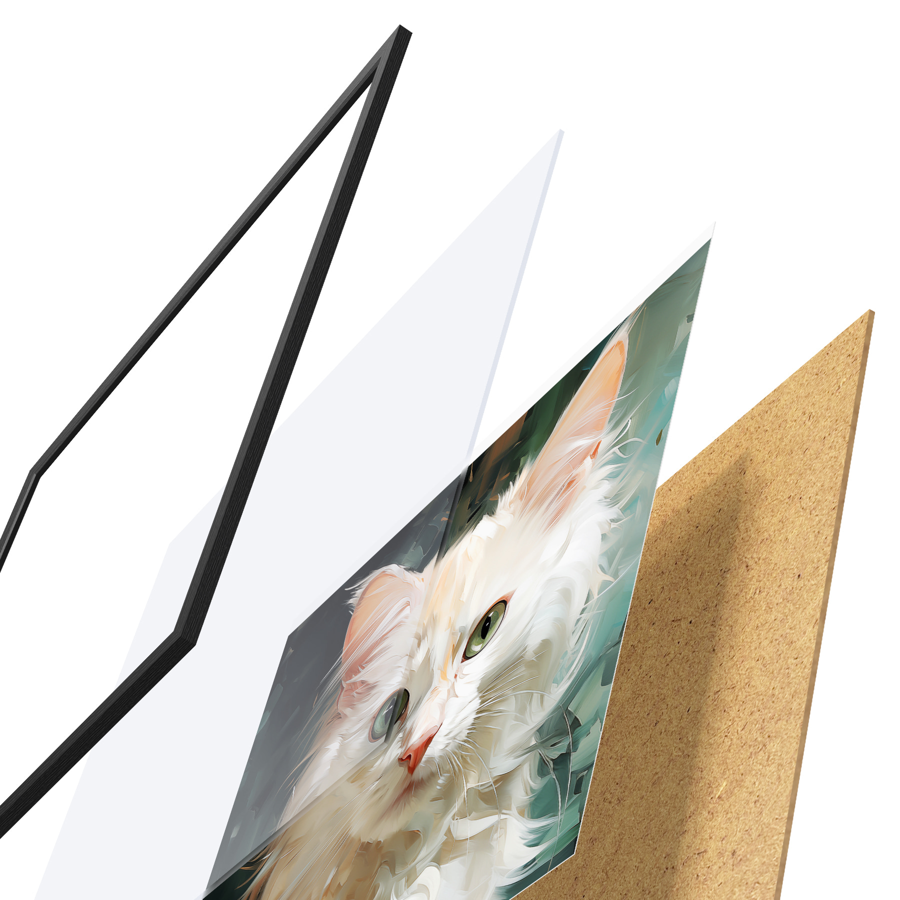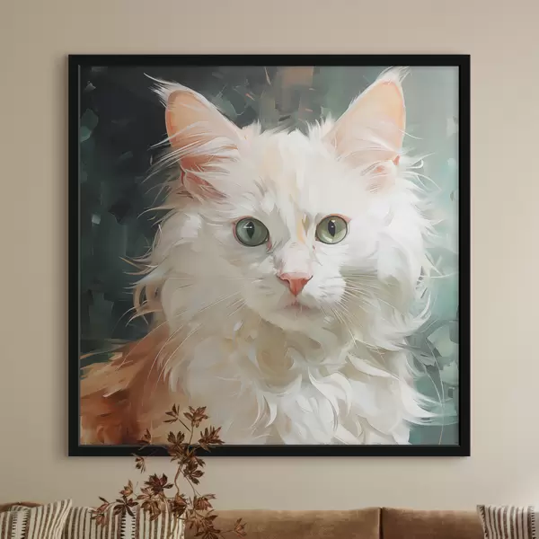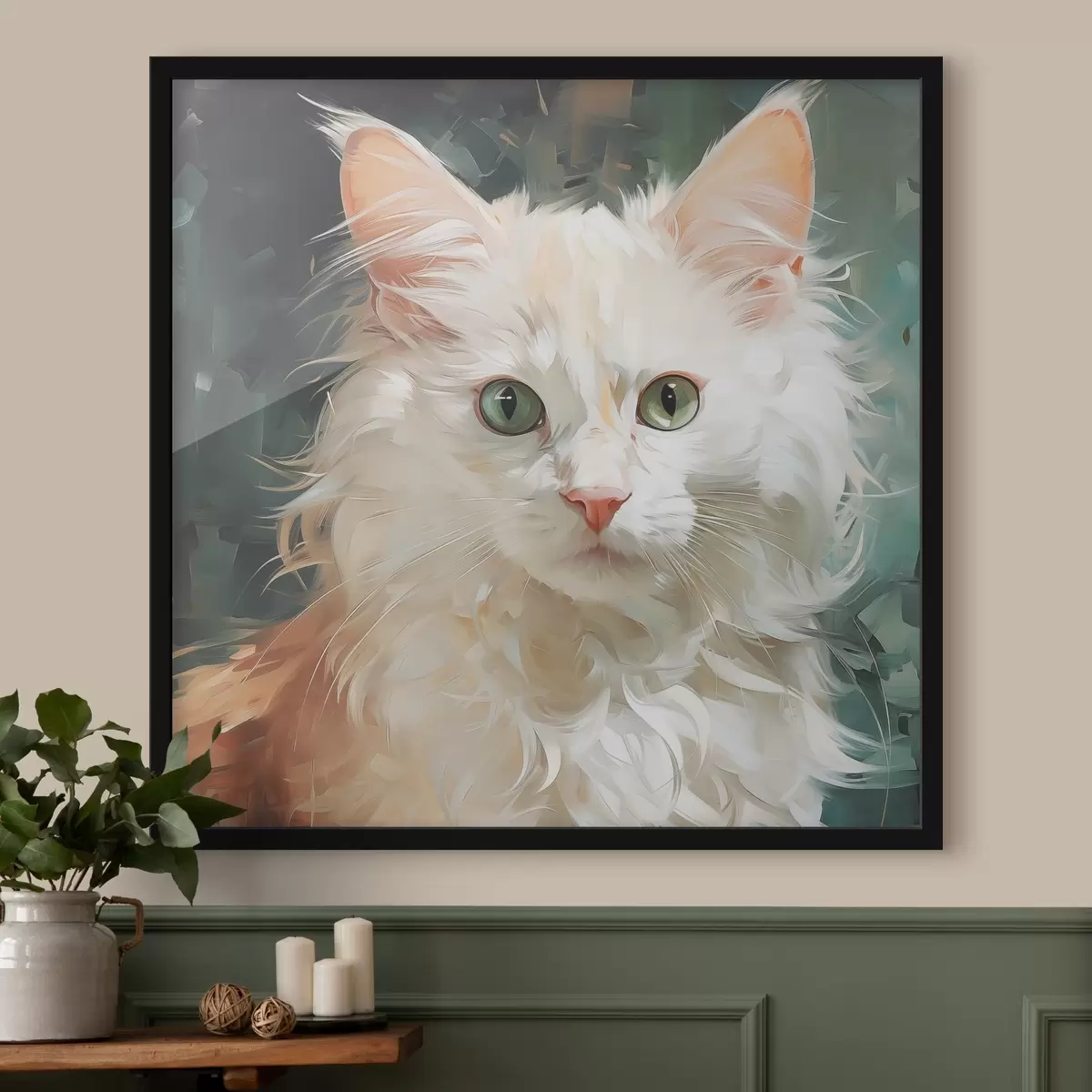 Plakatas Balta pūkuota katė žaliomis akimis žaliame portreto fone Ne f39132