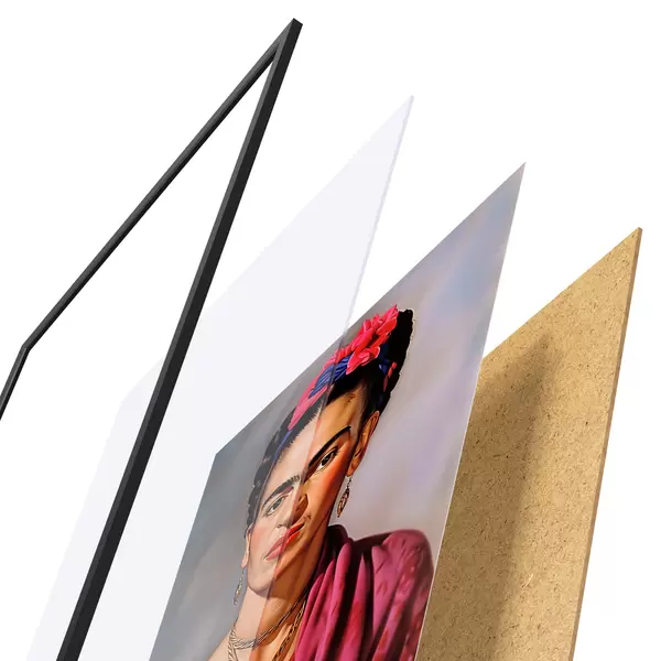 Plakatą sudaro rėmas, pleksiklas, atspausdintas vaizdas ir medžio drožlių plokštės pagrindas. Plakatą galima iš karto pakabinti ant sienos dėl kitoje pusėje esančių laikiklių.