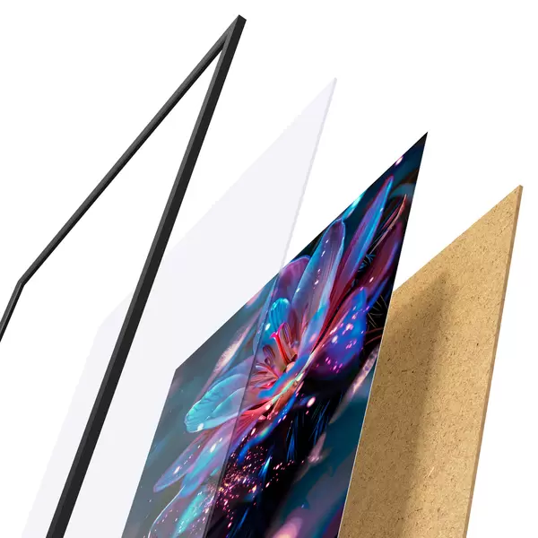 Plakatą sudaro rėmas, pleksiklas, atspausdintas vaizdas ir medžio drožlių plokštės pagrindas. Plakatą galima iš karto pakabinti ant sienos dėl kitoje pusėje esančių laikiklių.