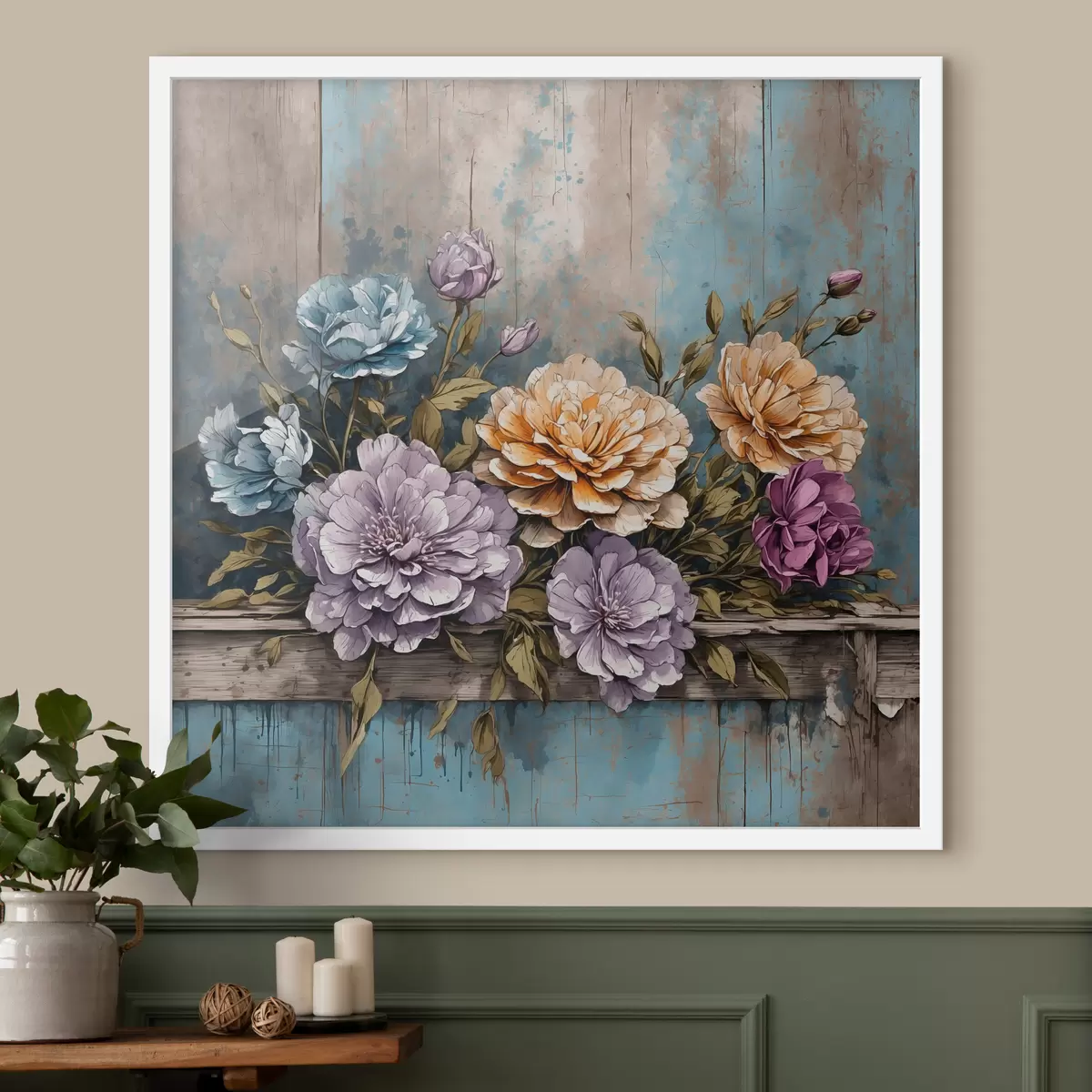 Plakatas Gėlės ir lapai ant senos medinės lentynos f39169
