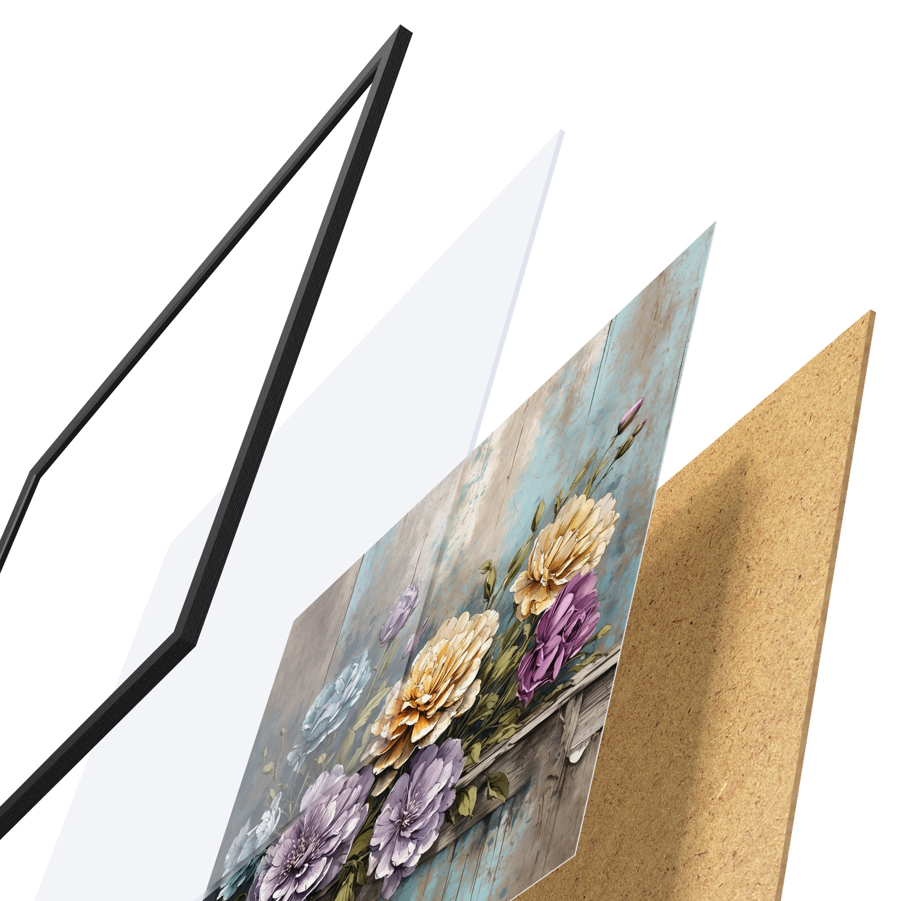 Plakatą sudaro rėmas, pleksiklas, atspausdintas vaizdas ir medžio drožlių plokštės pagrindas. Plakatą galima iš karto pakabinti ant sienos dėl kitoje pusėje esančių laikiklių.