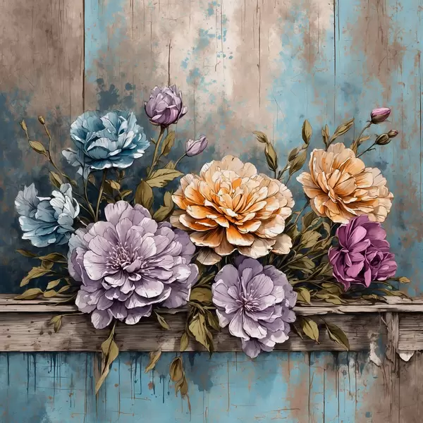 Plakatas Gėlės ir lapai ant senos medinės lentynos f39169