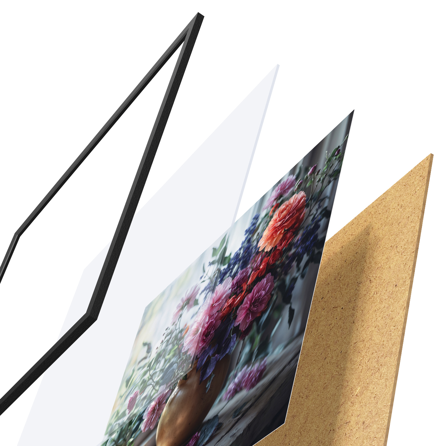 Plakatą sudaro rėmas, pleksiklas, atspausdintas vaizdas ir medžio drožlių plokštės pagrindas. Plakatą galima iš karto pakabinti ant sienos dėl kitoje pusėje esančių laikiklių.