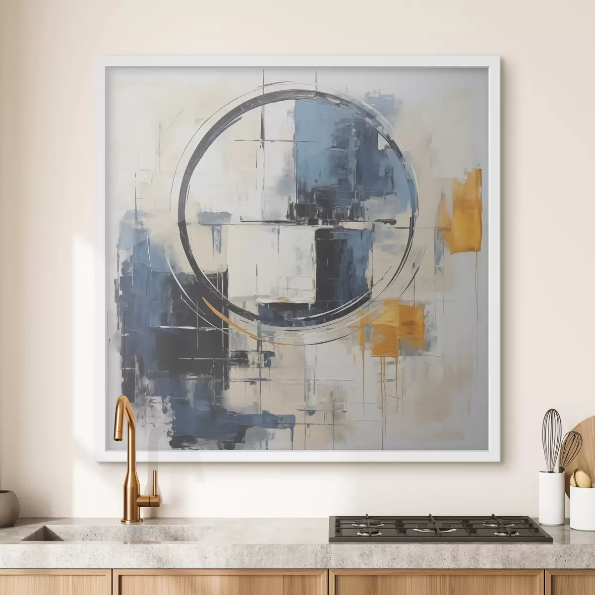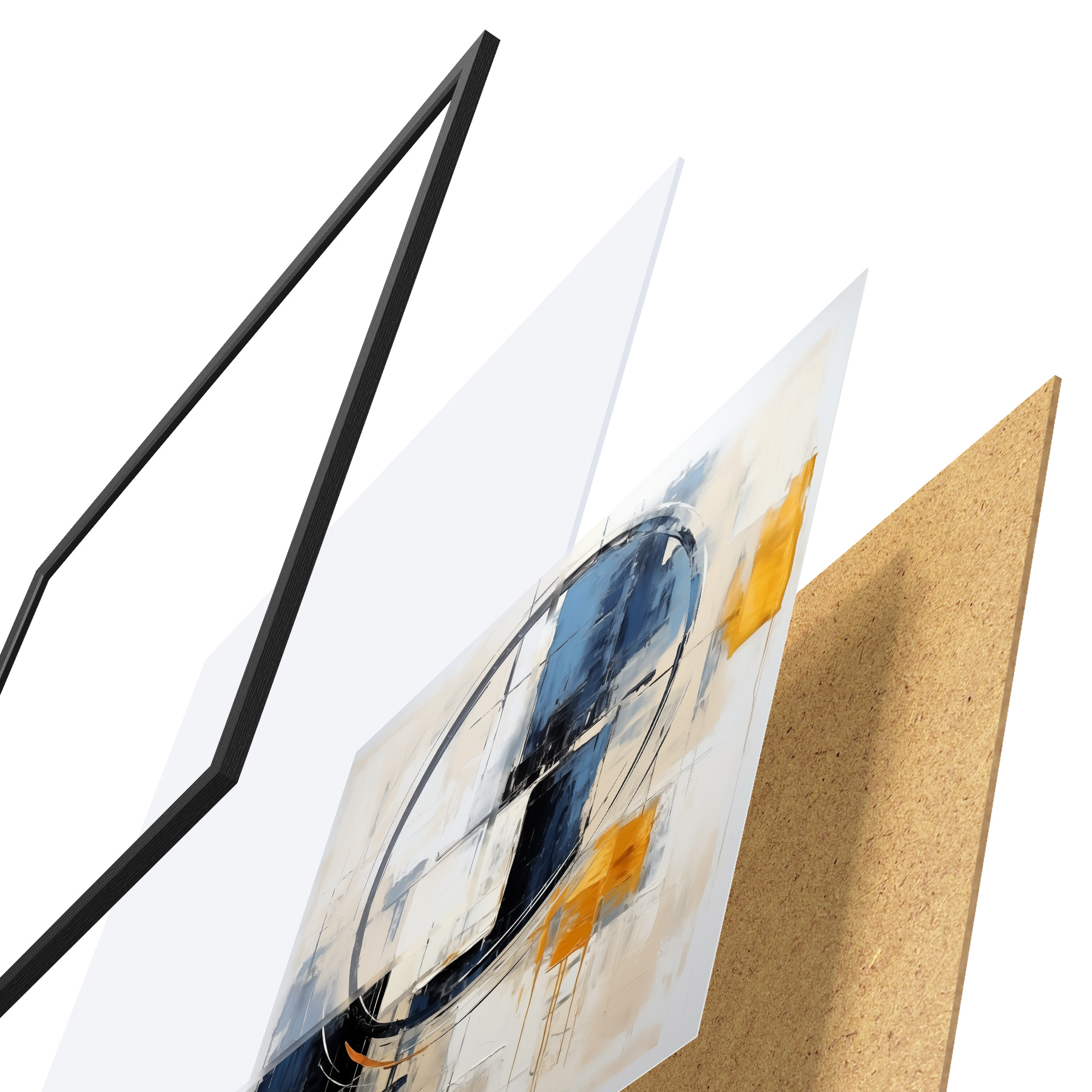 Plakatas Abstraktus kubizmas, mėlynos, oranžinės, baltos spalvos potėpiai, apskrita figūra f39179