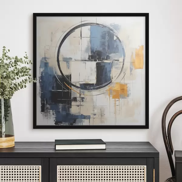 Plakatas Abstraktus kubizmas, mėlynos, oranžinės, baltos spalvos potėpiai, apskrita figūra Ne f39179