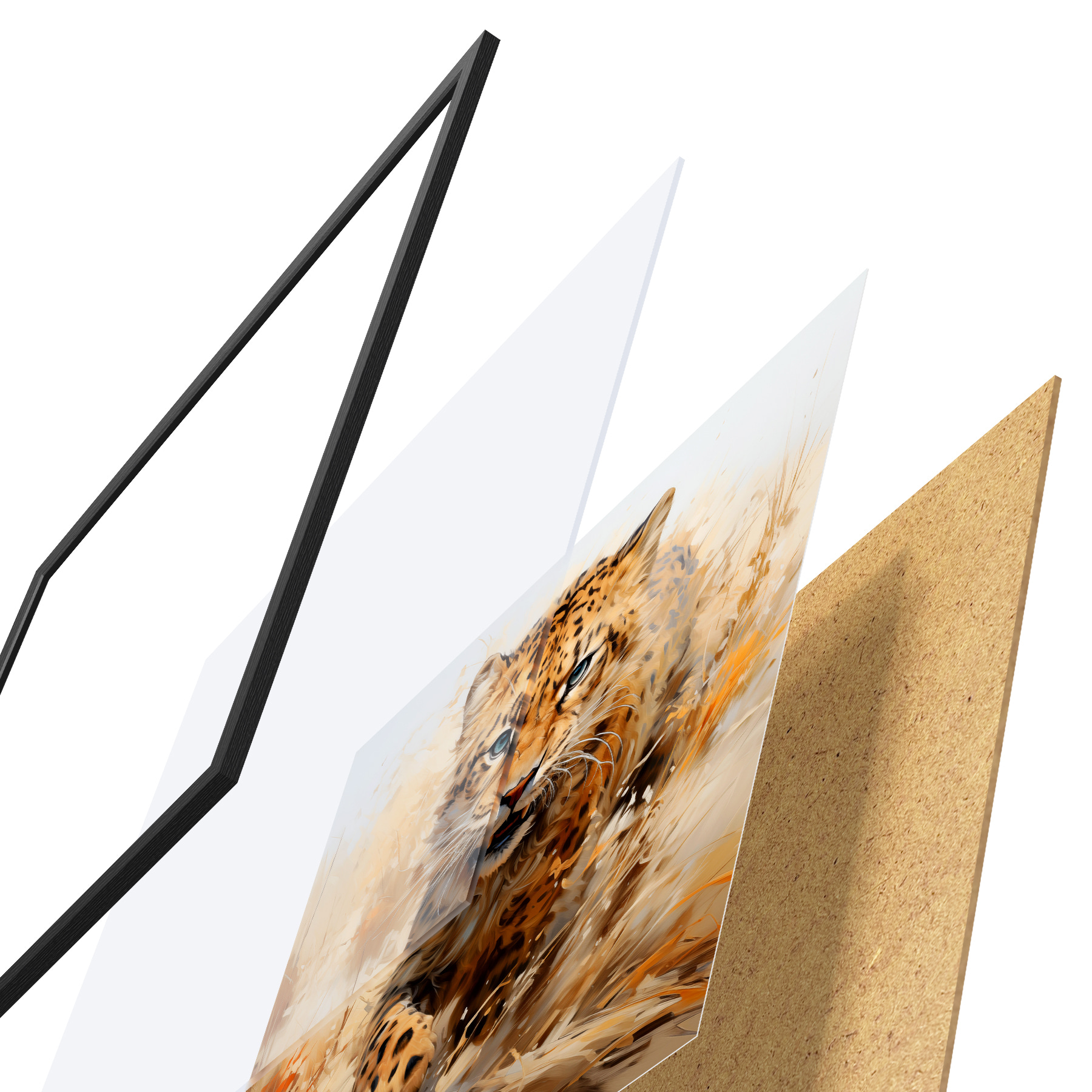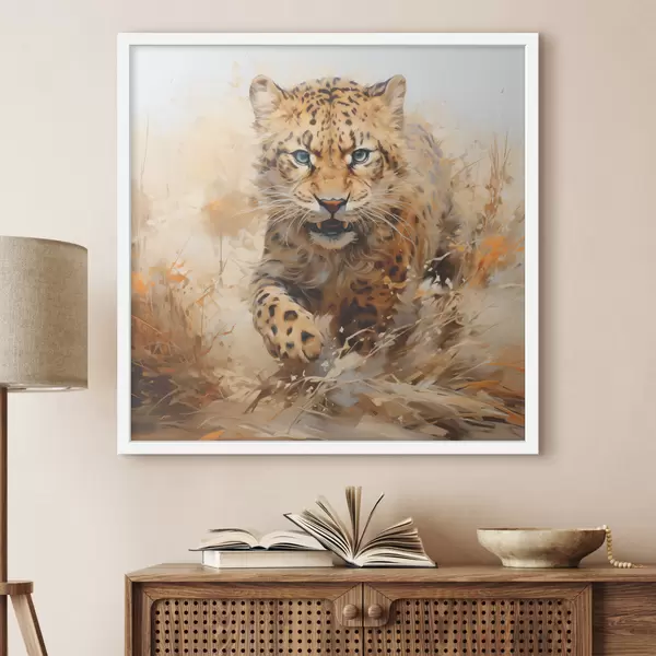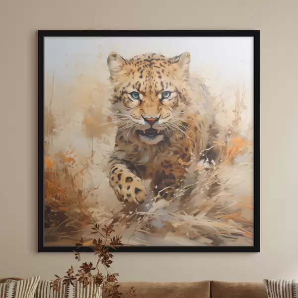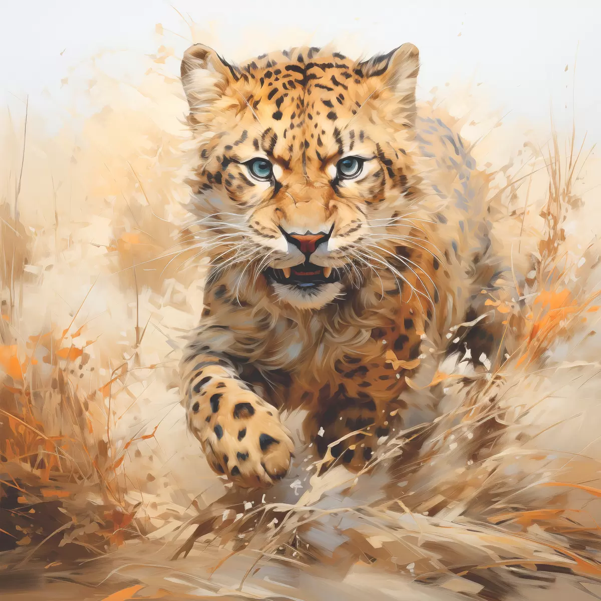 Plakatas Gepardas mėlynomis akimis ir iltimis sėdi ant sausos žolės aliejumi tapybos abstrakčiojo meno Ne f39182