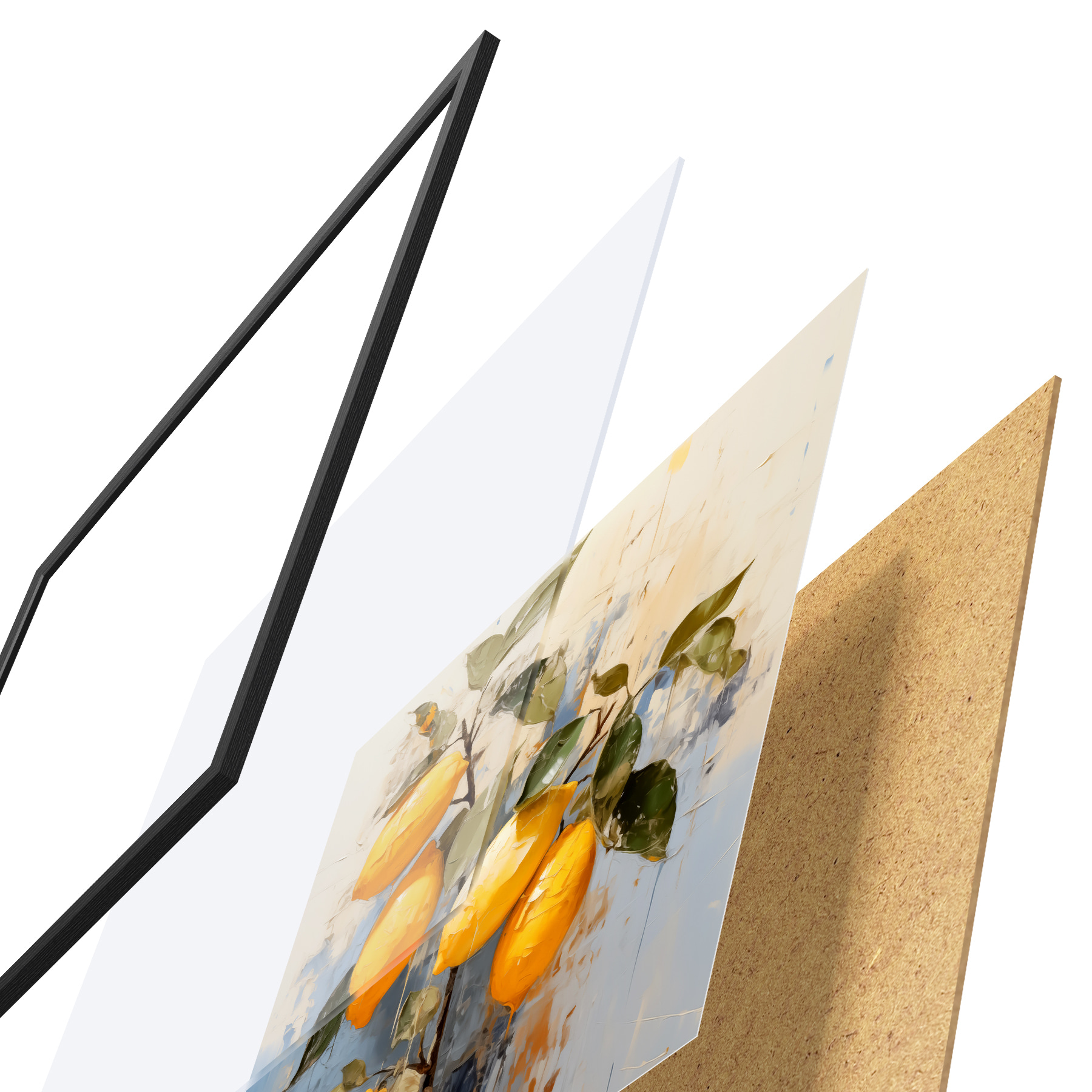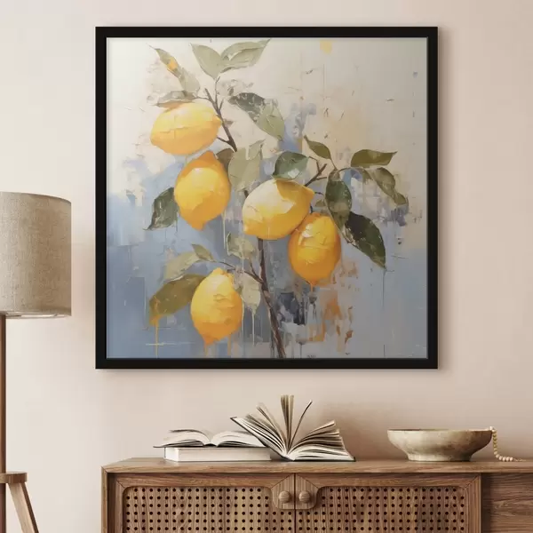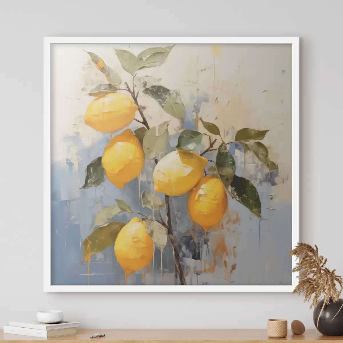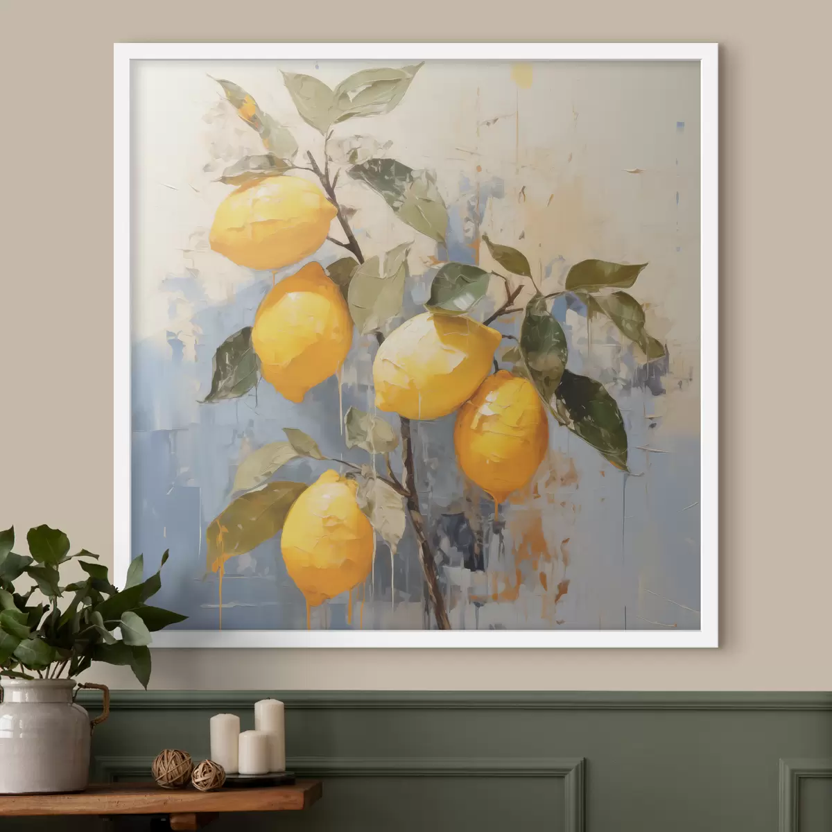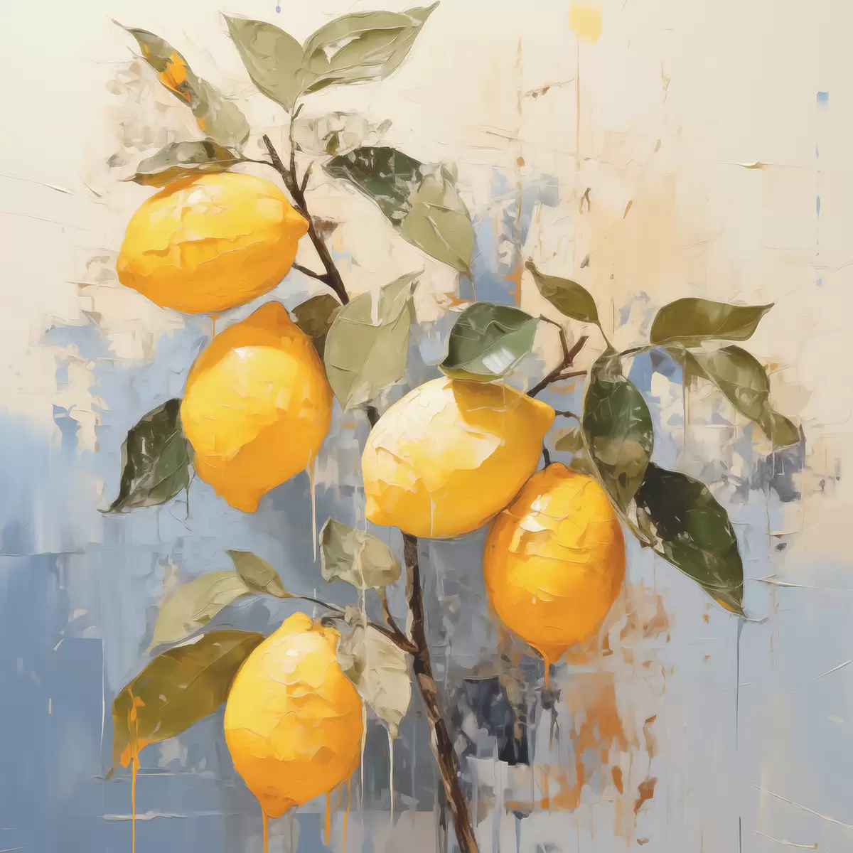 Plakatas Šaka su prinokusiomis citrinomis, tapyba aliejiniais dažais, abstraktus menas, geltonos, mėlynos ir žalios spalvos Ne f39186