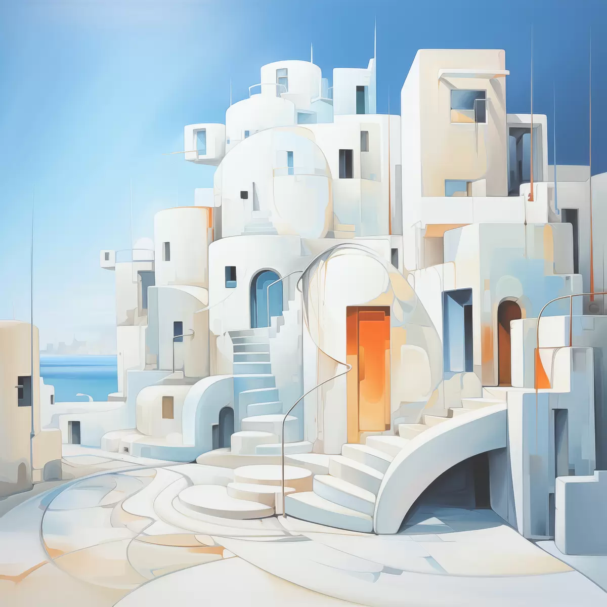 Plakatas Abstraktus baltas miestas prie jūros, architektūra, pastatas, mėlyna spalva f39188