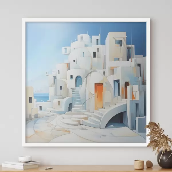 Plakatas Abstraktus baltas miestas prie jūros, architektūra, pastatas, mėlyna spalva f39188