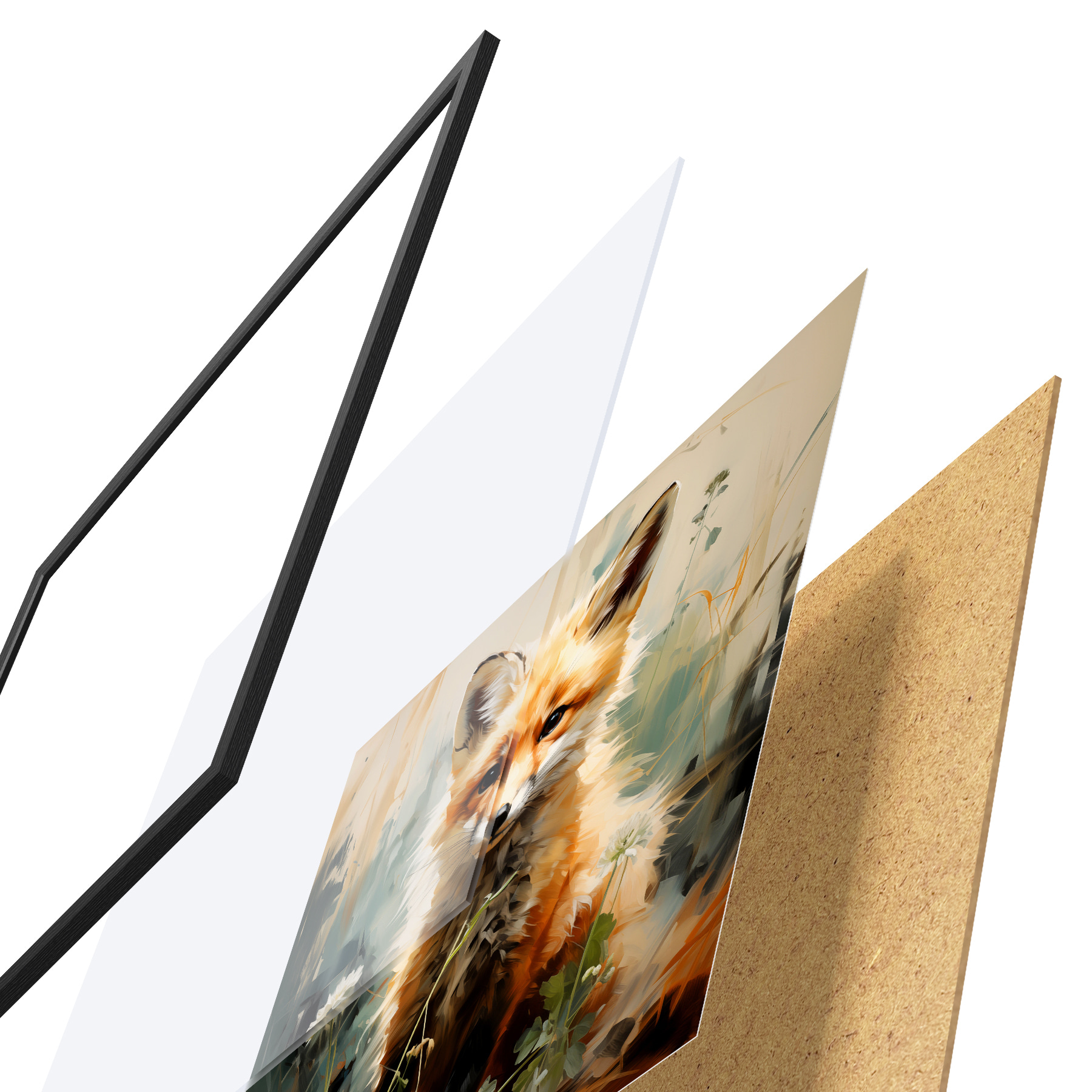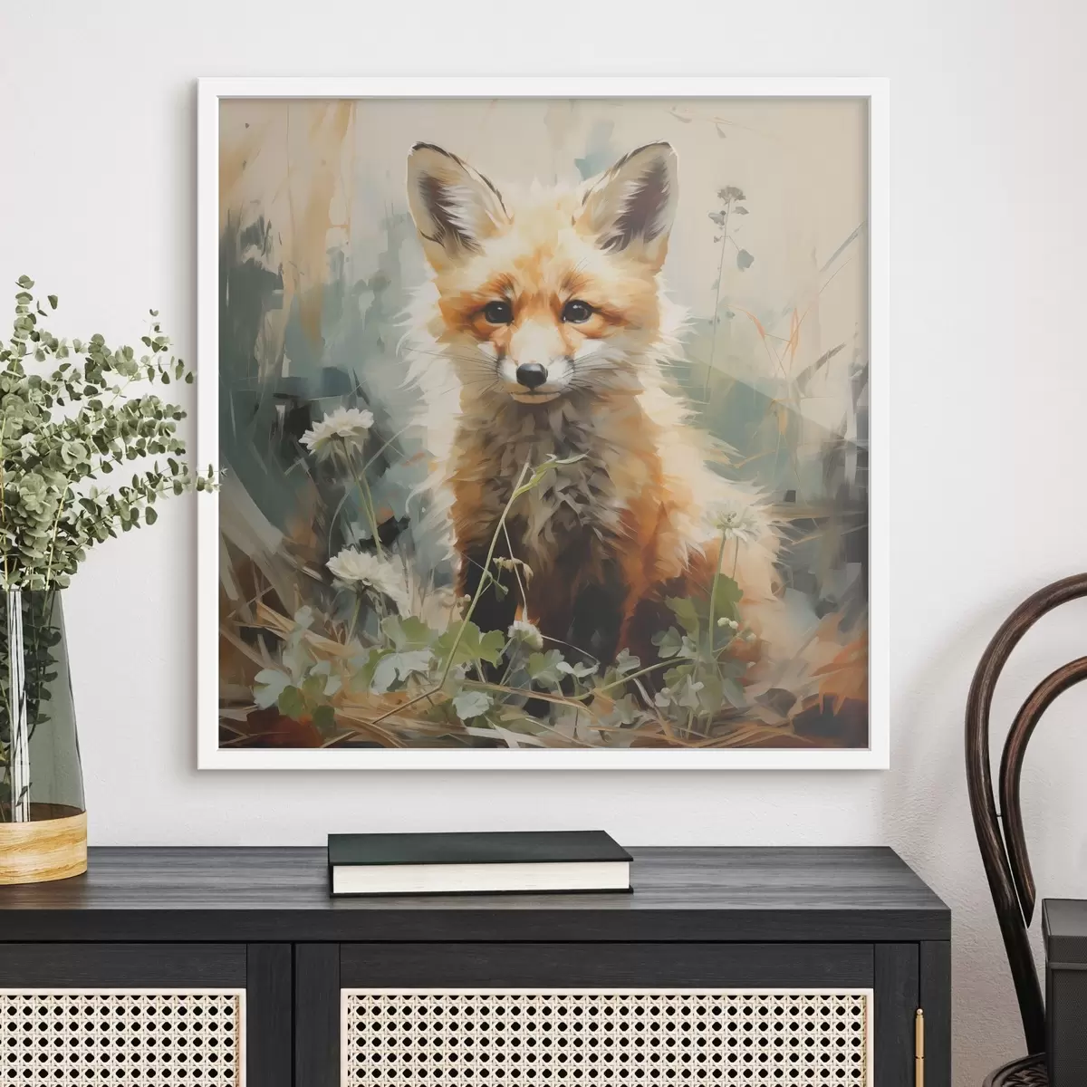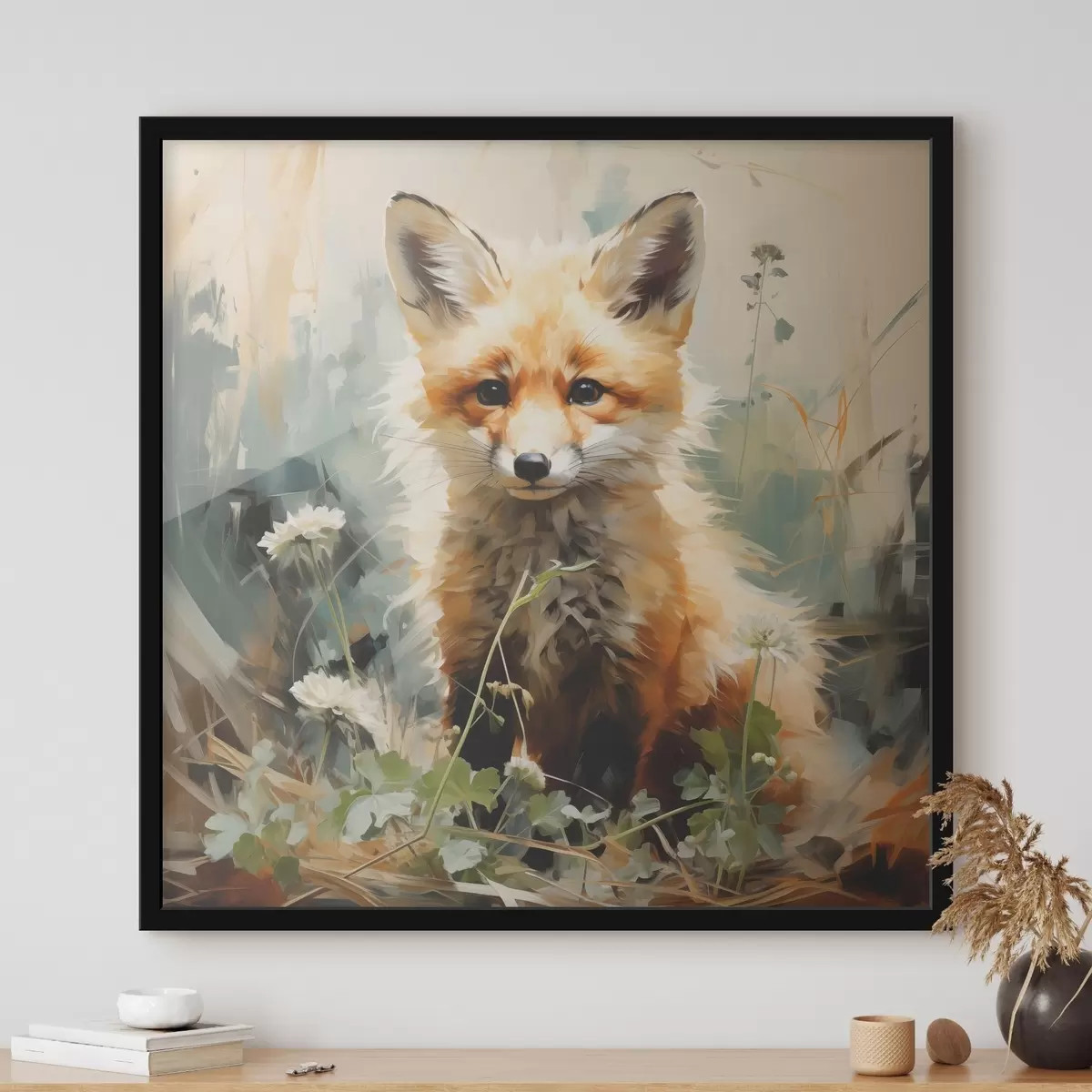 Plakatas Raudonoji lapė sėdi sausoje žolėje žaliame fone. Tapyba aliejiniais dažais f39191