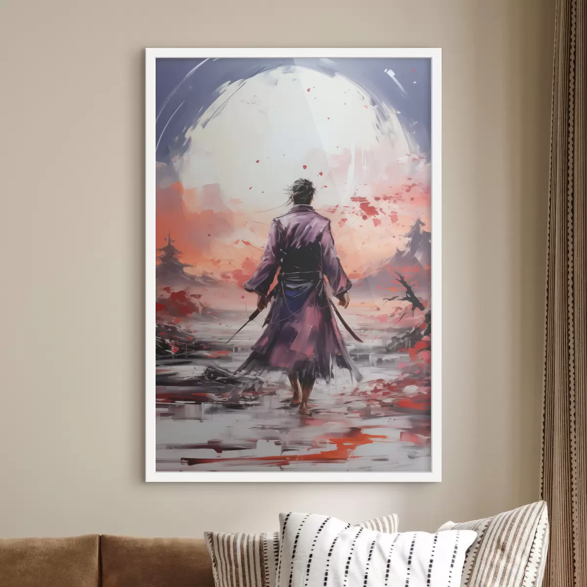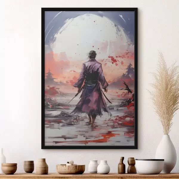 Plakatas Samurajus su kardu violetiniu apsiaustu eina link kalnų abstrakčiojo meno tapybos Ne f39194