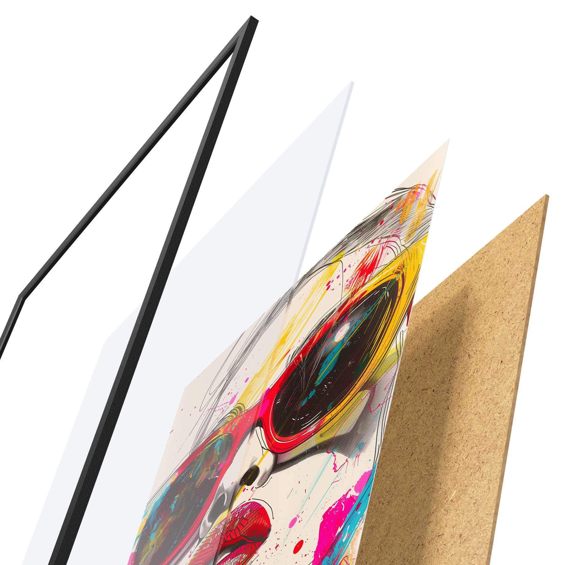 Plakatą sudaro rėmas, pleksiklas, atspausdintas vaizdas ir medžio drožlių plokštės pagrindas. Plakatą galima iš karto pakabinti ant sienos dėl kitoje pusėje esančių laikiklių.