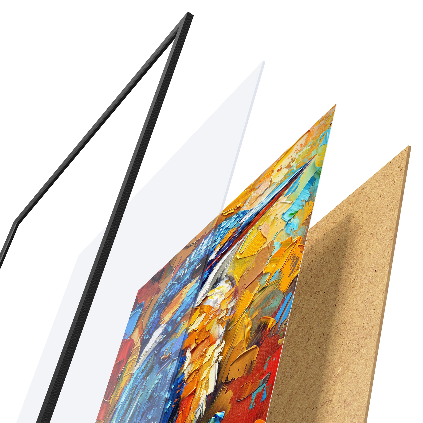Plakatą sudaro rėmas, pleksiklas, atspausdintas vaizdas ir medžio drožlių plokštės pagrindas. Plakatą galima iš karto pakabinti ant sienos dėl kitoje pusėje esančių laikiklių.