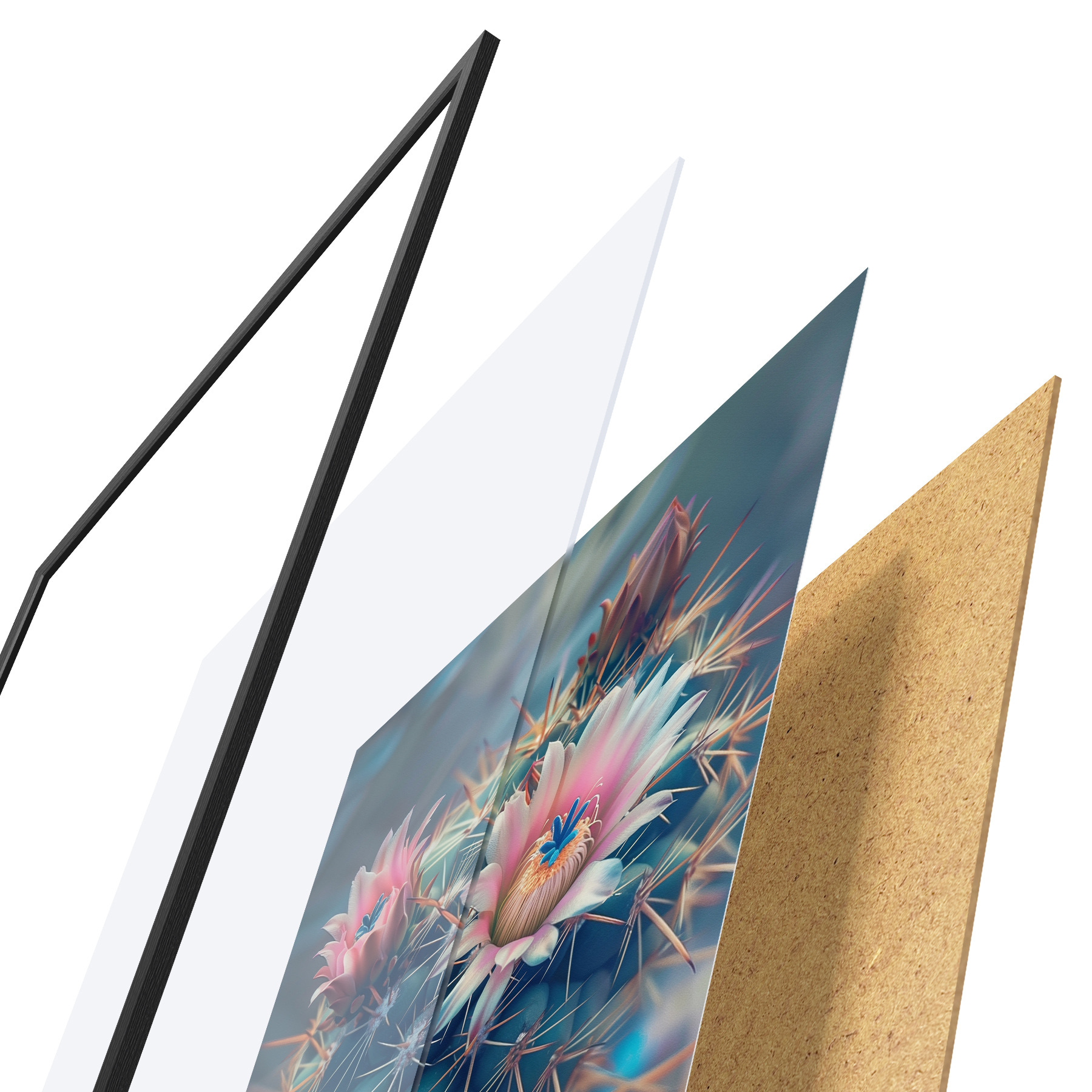 Plakatą sudaro rėmas, pleksiklas, atspausdintas vaizdas ir medžio drožlių plokštės pagrindas. Plakatą galima iš karto pakabinti ant sienos dėl kitoje pusėje esančių laikiklių.