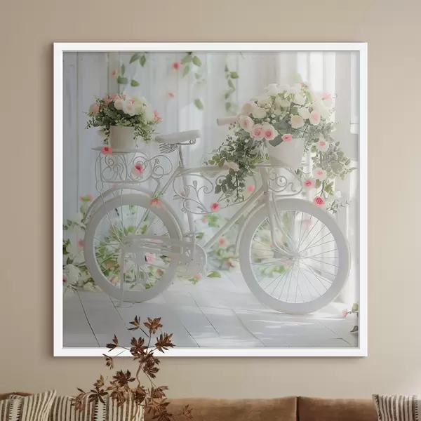 Plakatas Baltas dviratis su gėlių krepšeliu Provanso stiliumi f39243