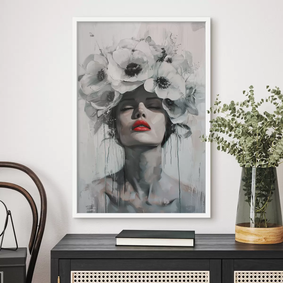 Plakatas Moters portretas su gėlėmis plaukuose ir raudonomis lūpomis Ne f39253