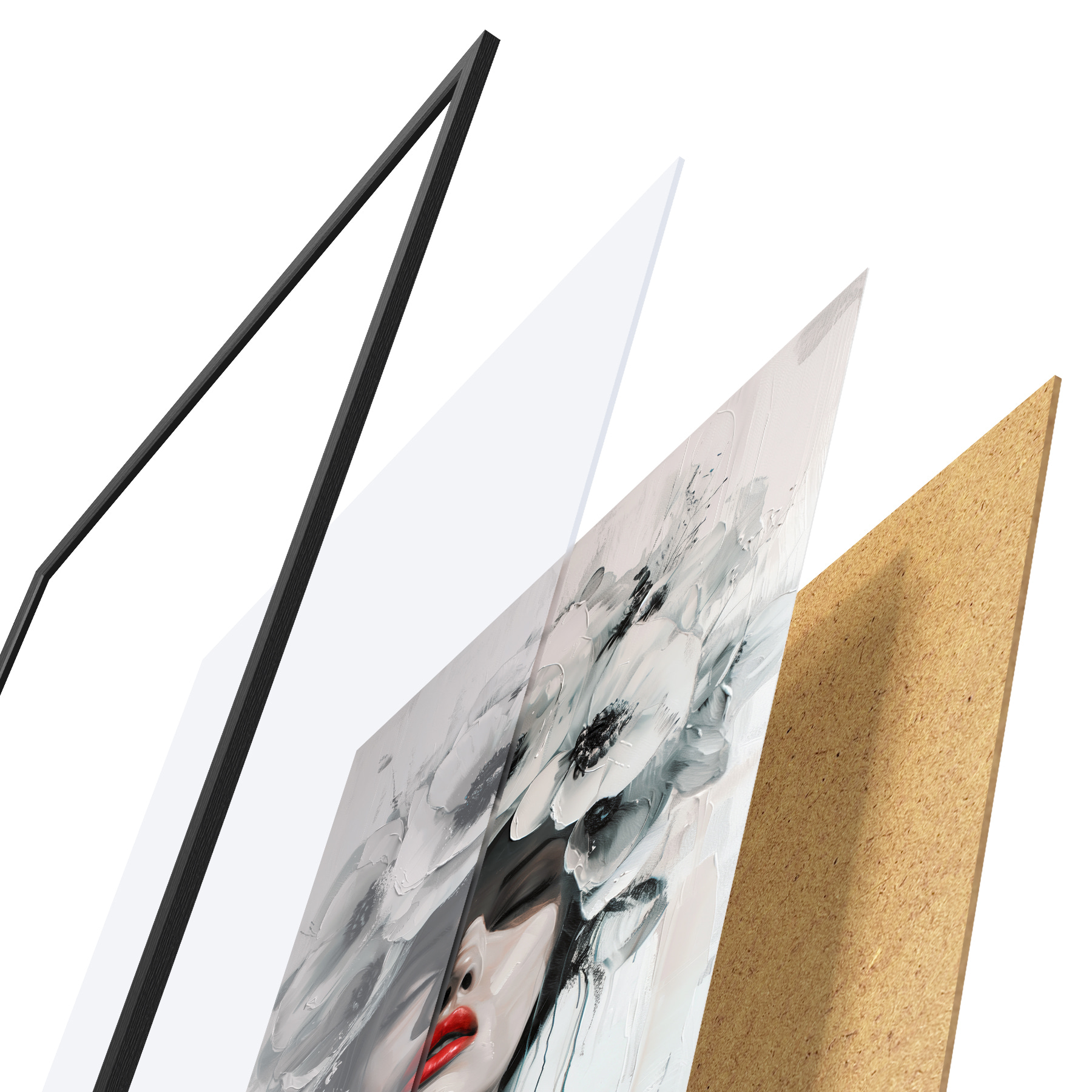Plakatą sudaro rėmas, pleksiklas, atspausdintas vaizdas ir medžio drožlių plokštės pagrindas. Plakatą galima iš karto pakabinti ant sienos dėl kitoje pusėje esančių laikiklių.