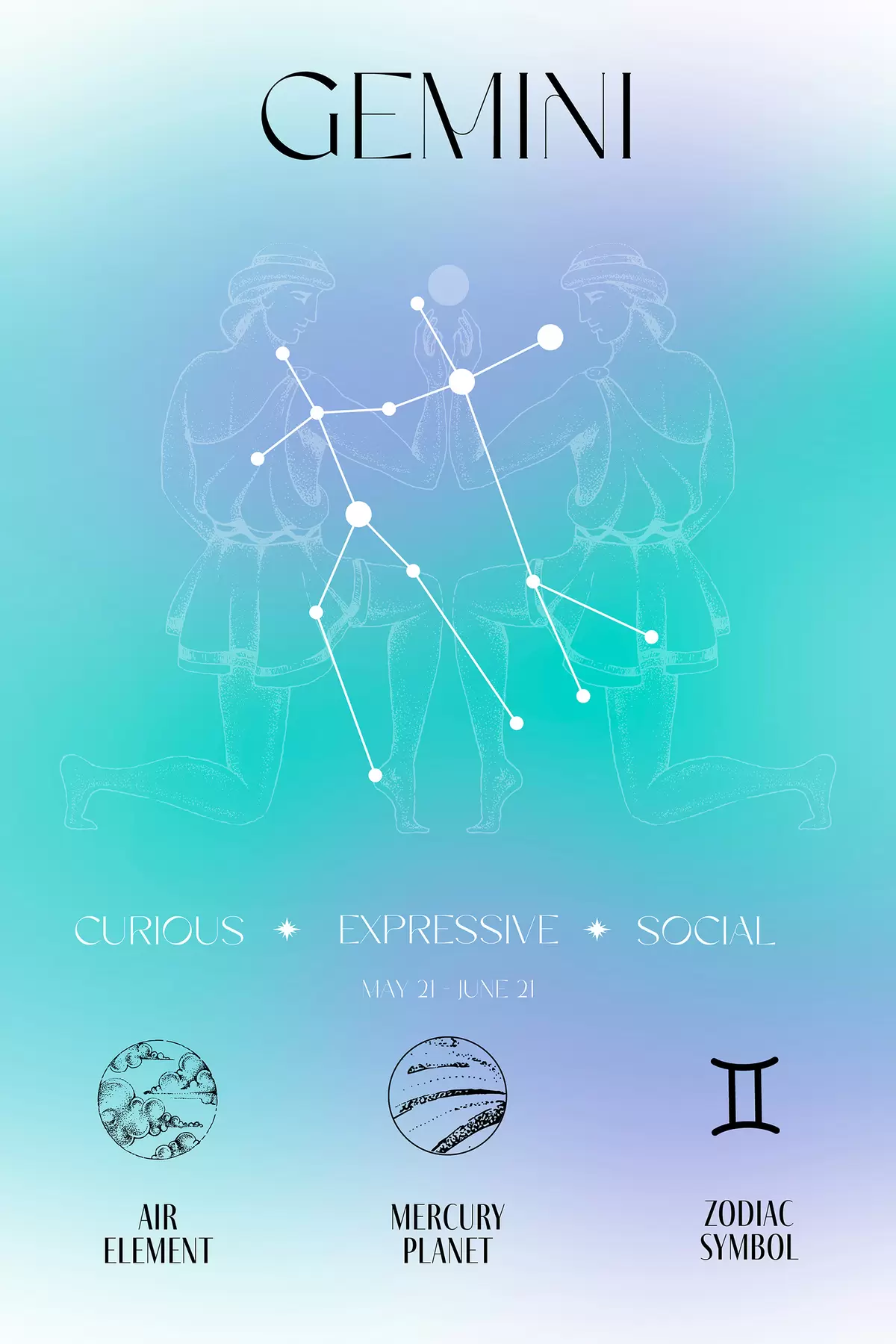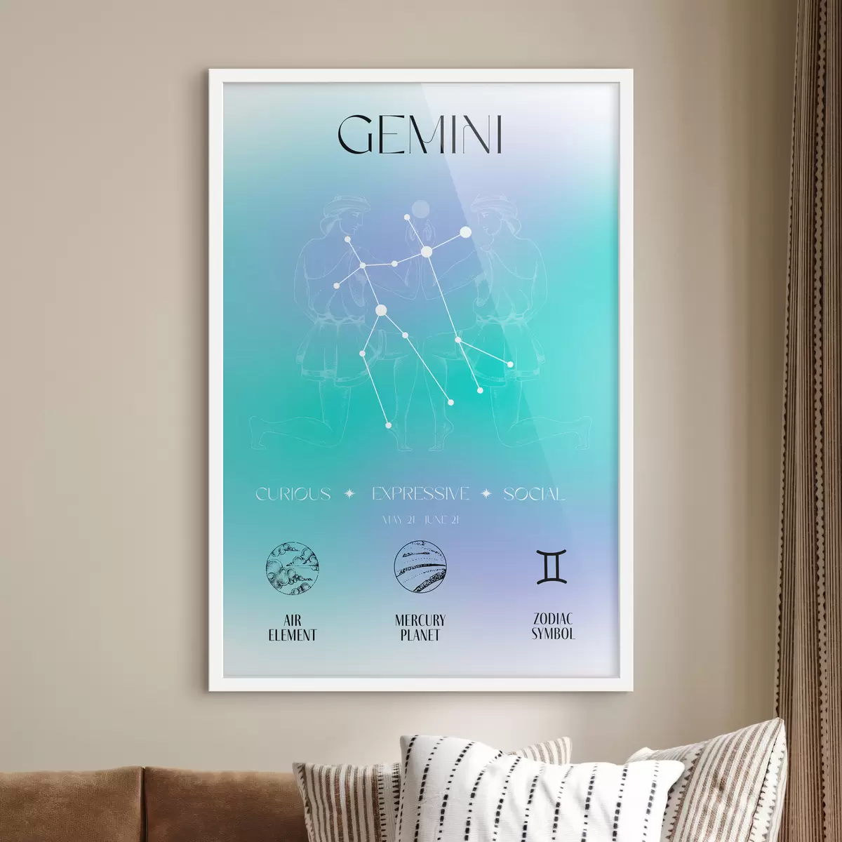 Plakatas Dvynių zodiako ženklas, žvaigždynai, kosminis, planetos, astrologija, mėlyna ir violetinė spalvos Ne f39279