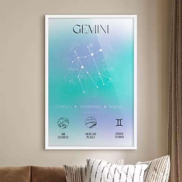 Plakatas Dvynių zodiako ženklas, žvaigždynai, kosminis, planetos, astrologija, mėlyna ir violetinė spalvos f39279