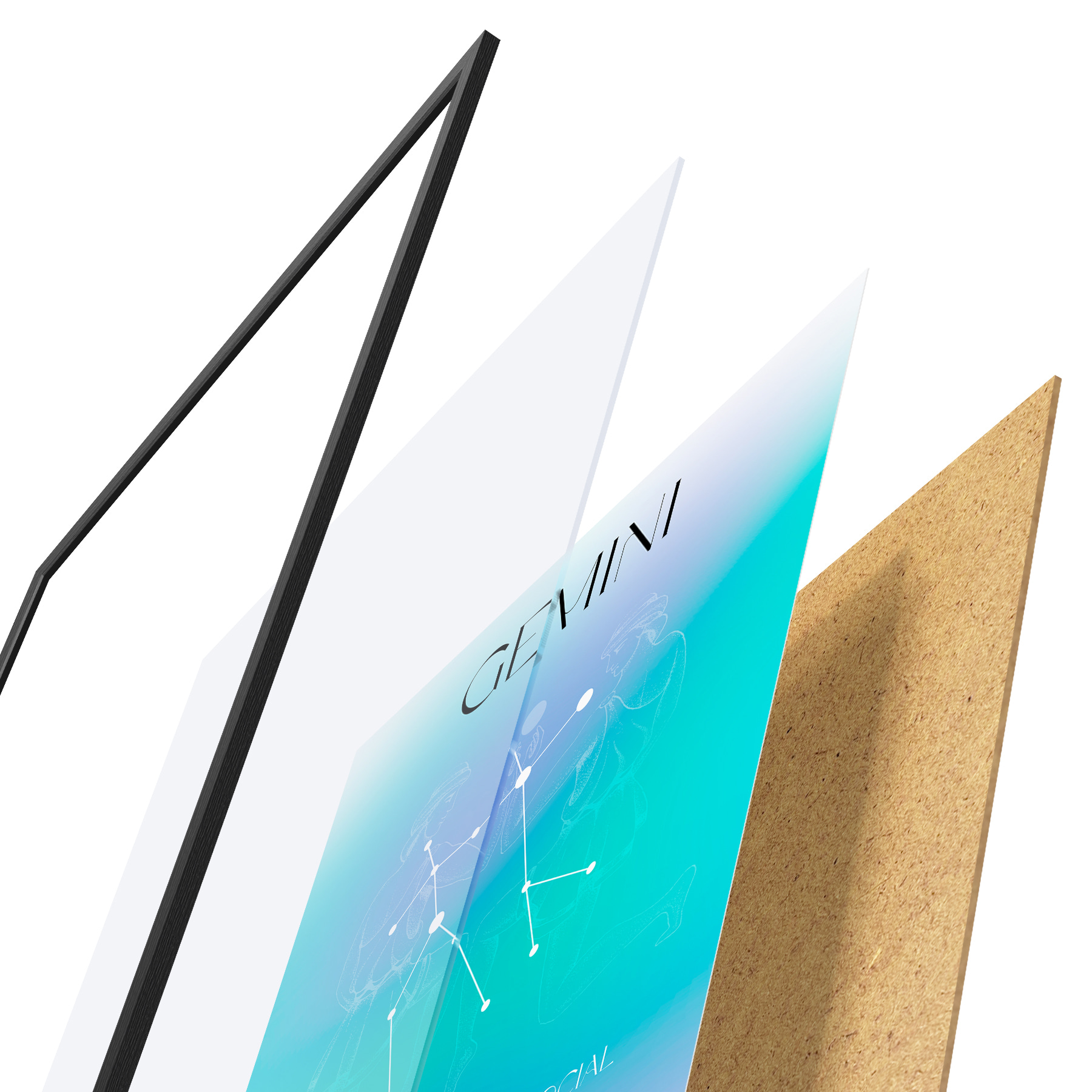 Plakatą sudaro rėmas, pleksiklas, atspausdintas vaizdas ir medžio drožlių plokštės pagrindas. Plakatą galima iš karto pakabinti ant sienos dėl kitoje pusėje esančių laikiklių.