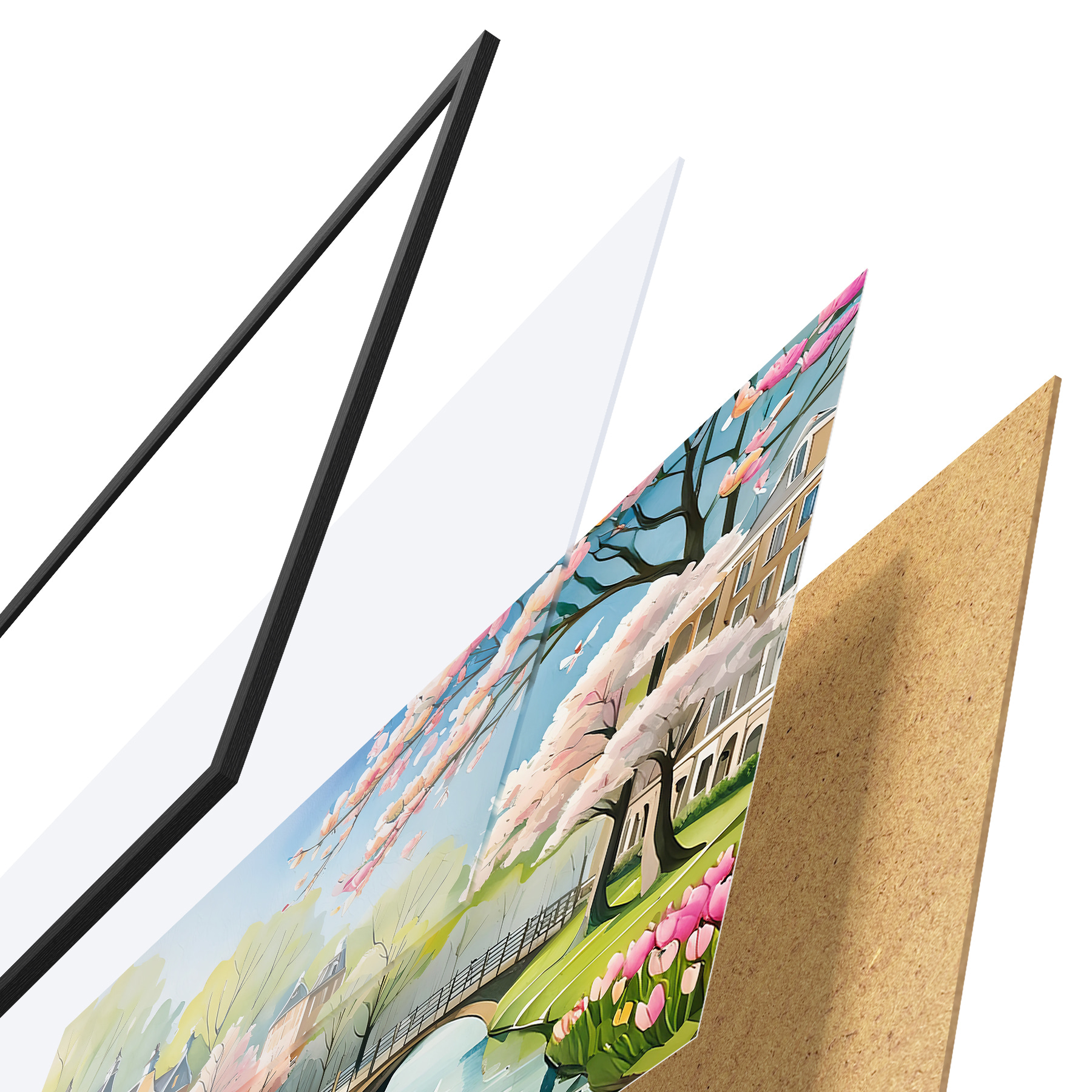Plakatą sudaro rėmas, pleksiklas, atspausdintas vaizdas ir medžio drožlių plokštės pagrindas. Plakatą galima iš karto pakabinti ant sienos dėl kitoje pusėje esančių laikiklių.