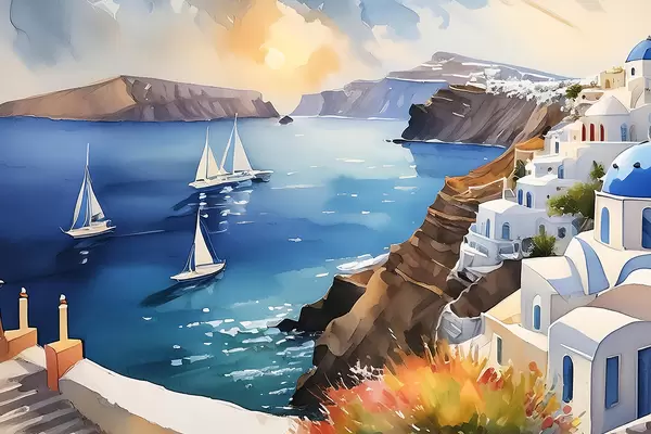 Plakatas gražus Santorinio miestas prie jūros f39303