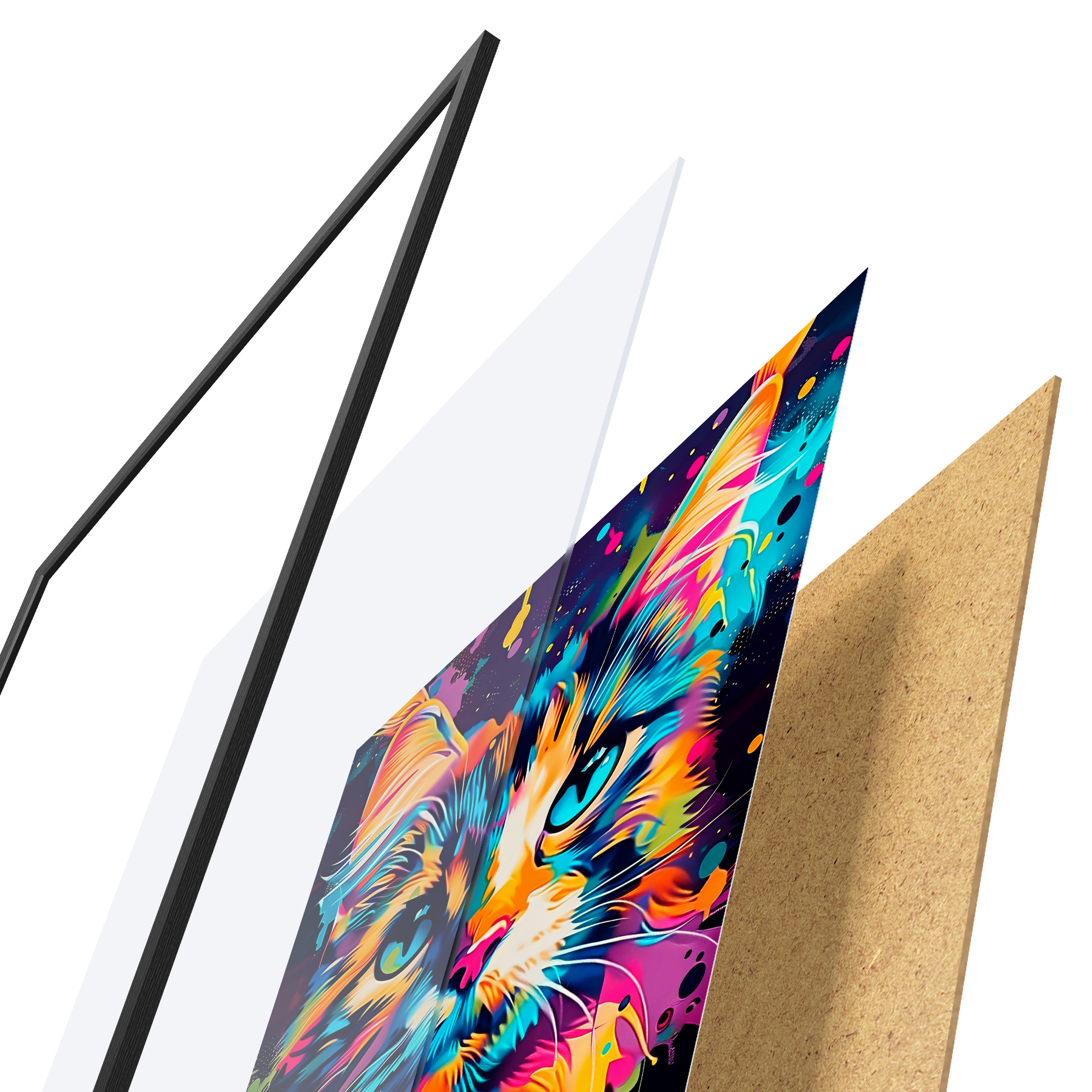 Plakatą sudaro rėmas, pleksiklas, atspausdintas vaizdas ir medžio drožlių plokštės pagrindas. Plakatą galima iš karto pakabinti ant sienos dėl kitoje pusėje esančių laikiklių.
