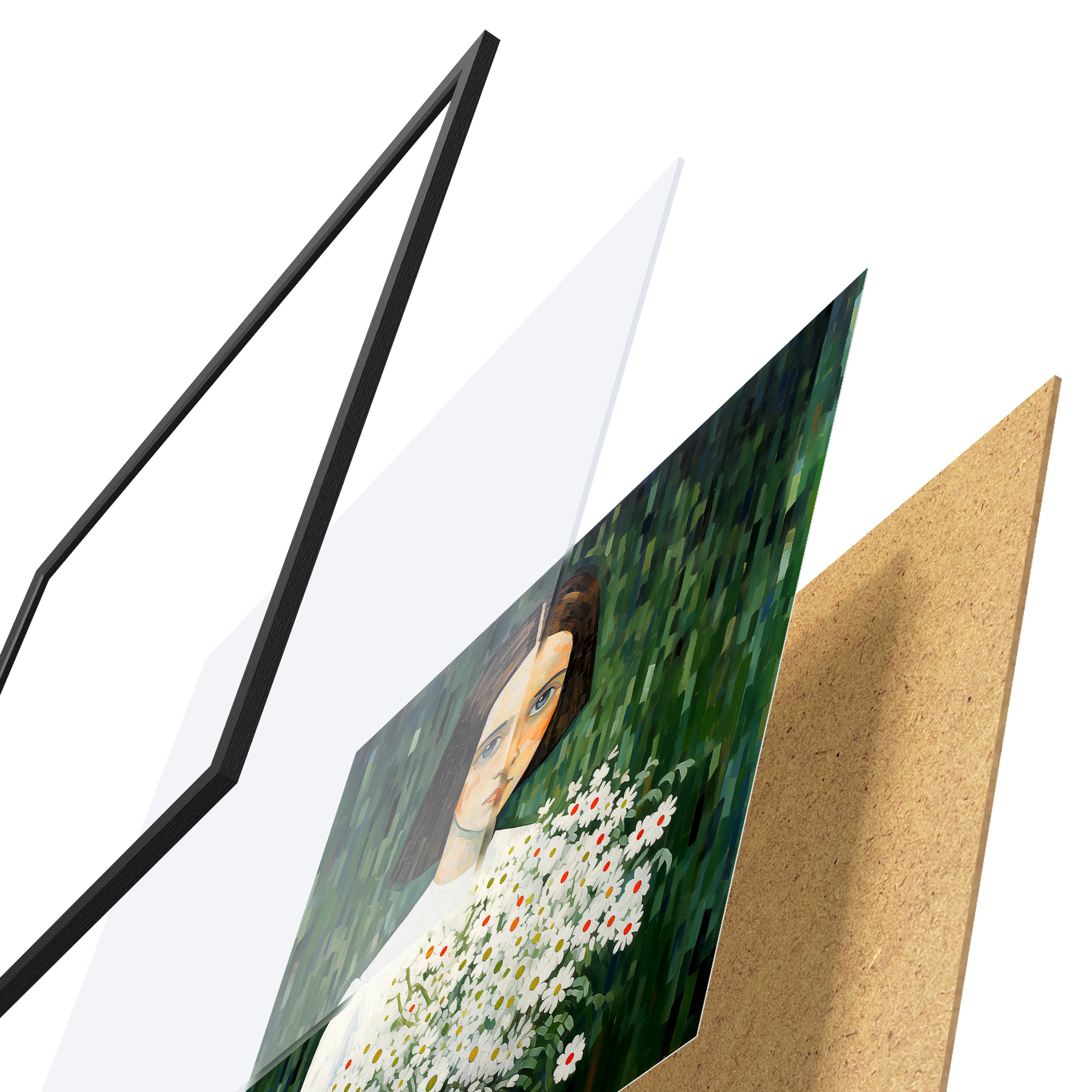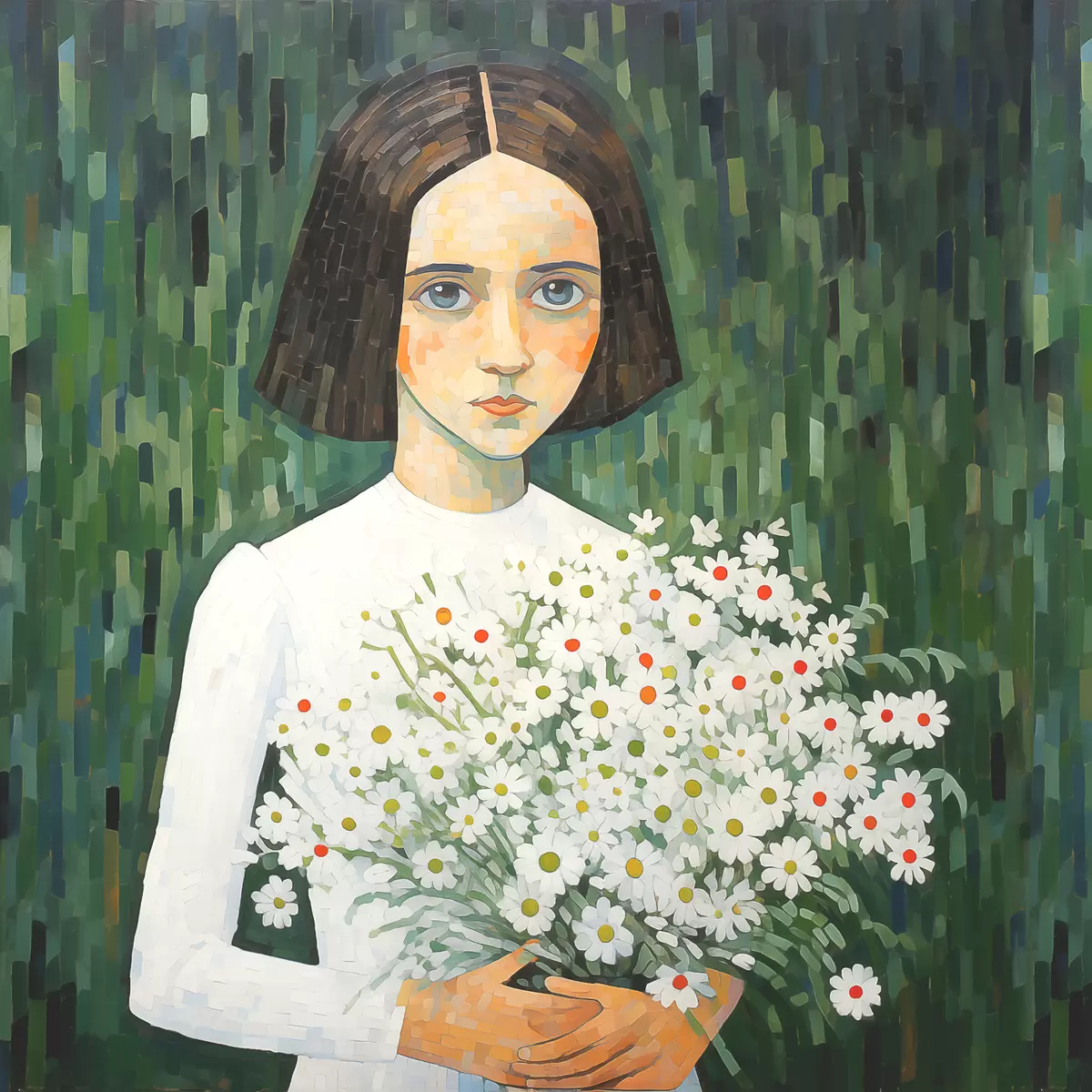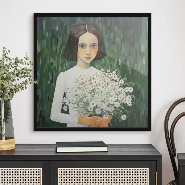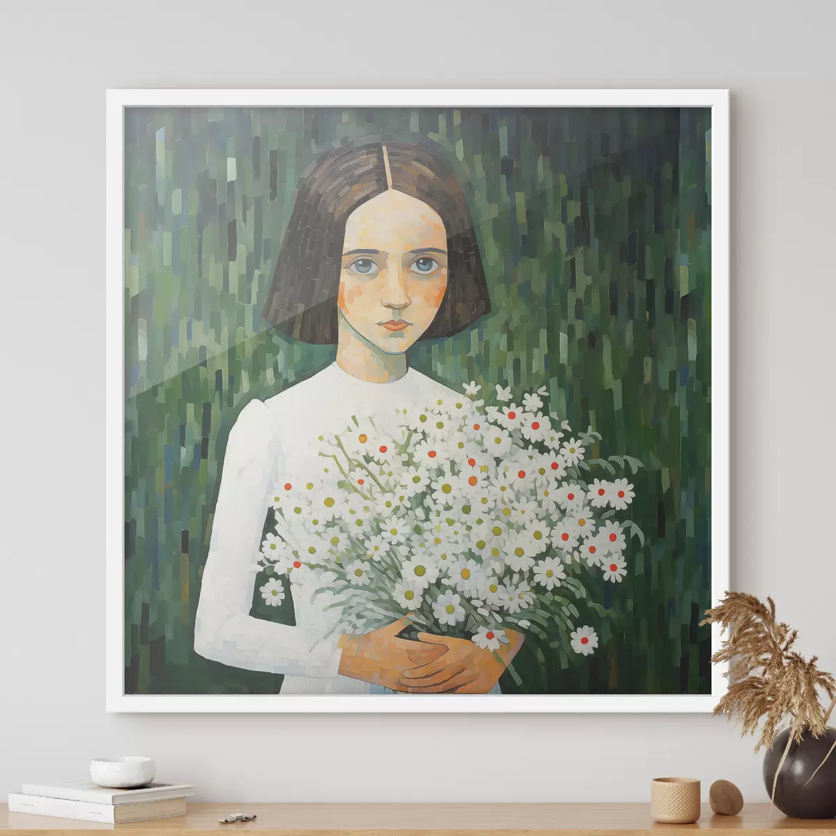 Plakatas Mergina balta suknele su baltų ramunėlių puokšte rankose žaliame fone Ne f39328