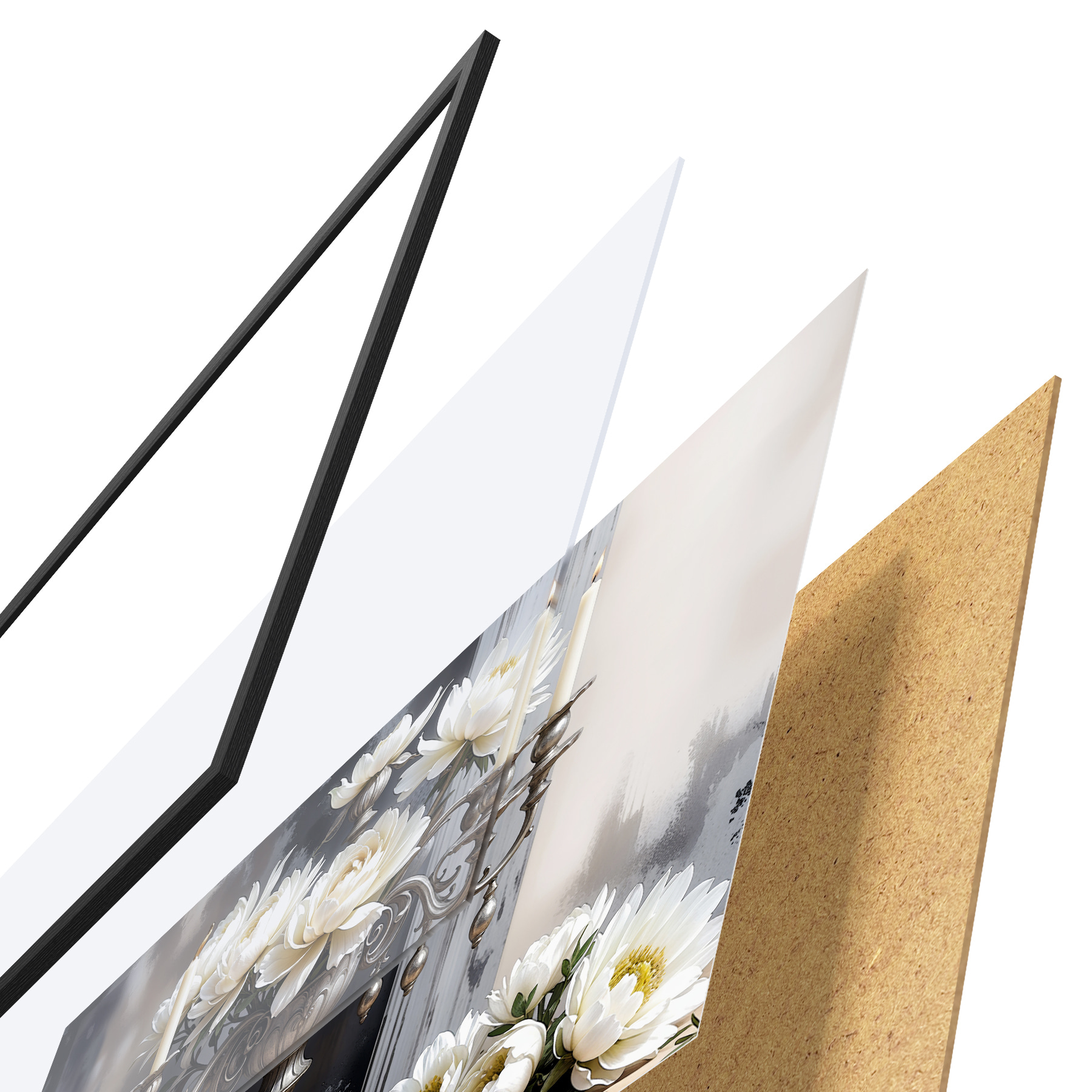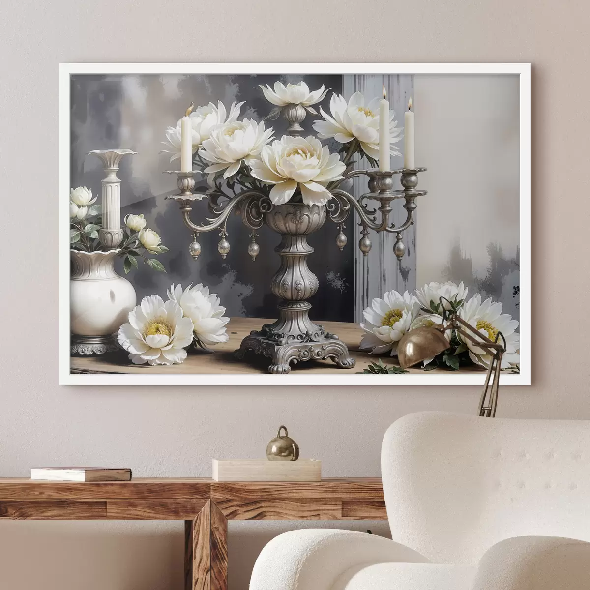 Plakatas Didelių baltų jurginų gėlių puokštė puošnioje sidabrinėje vazoje, apsupta uždegtų žvakių ant medinio stalo f39384