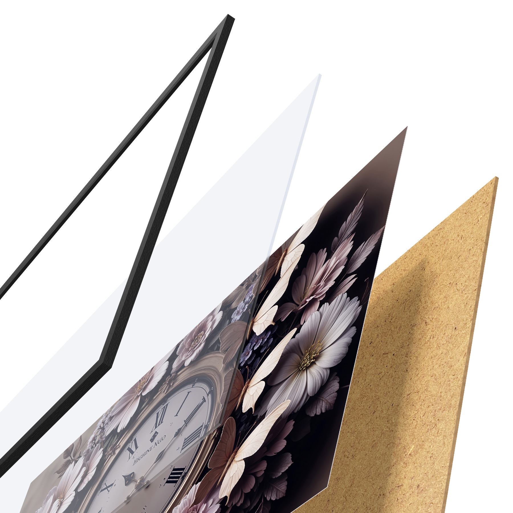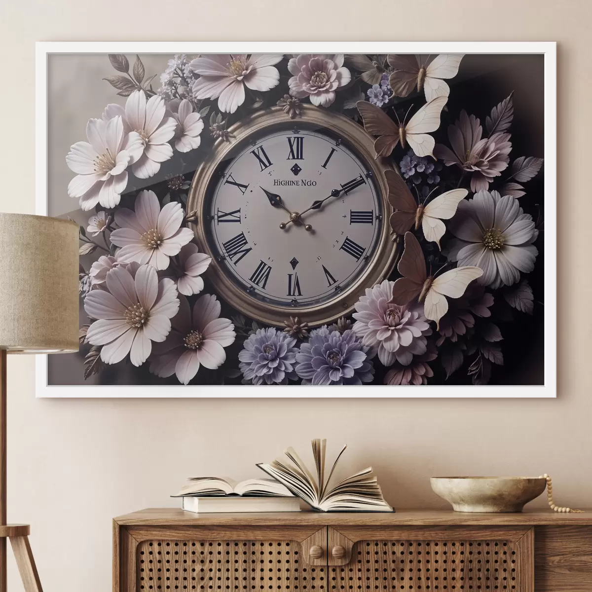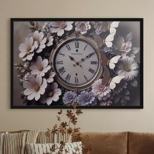 Plakatas Antikvarinis laikrodis, apsuptas gražių violetinių ir rausvų gėlių tamsiame fone Ne f39386