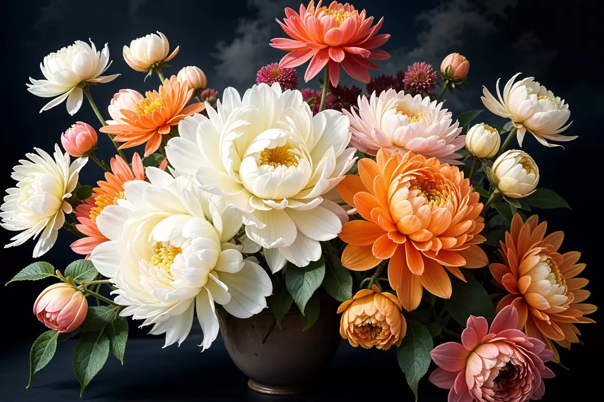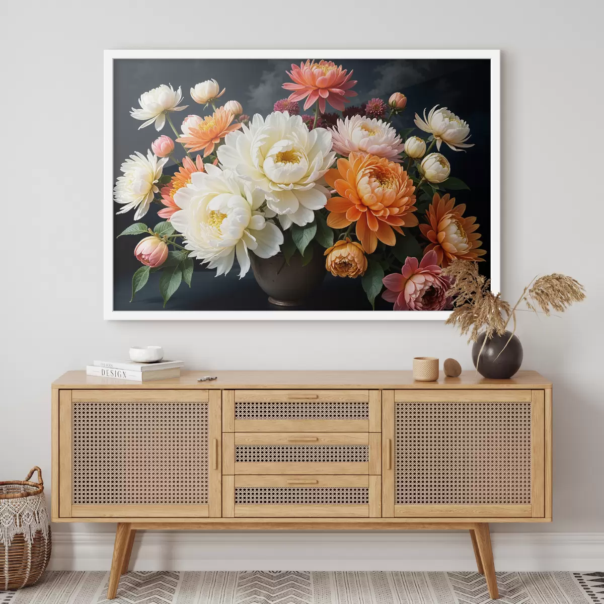 Plakatas Įvairių spalvų ryškių jurginų gėlių puokštė tamsiame fone f39399