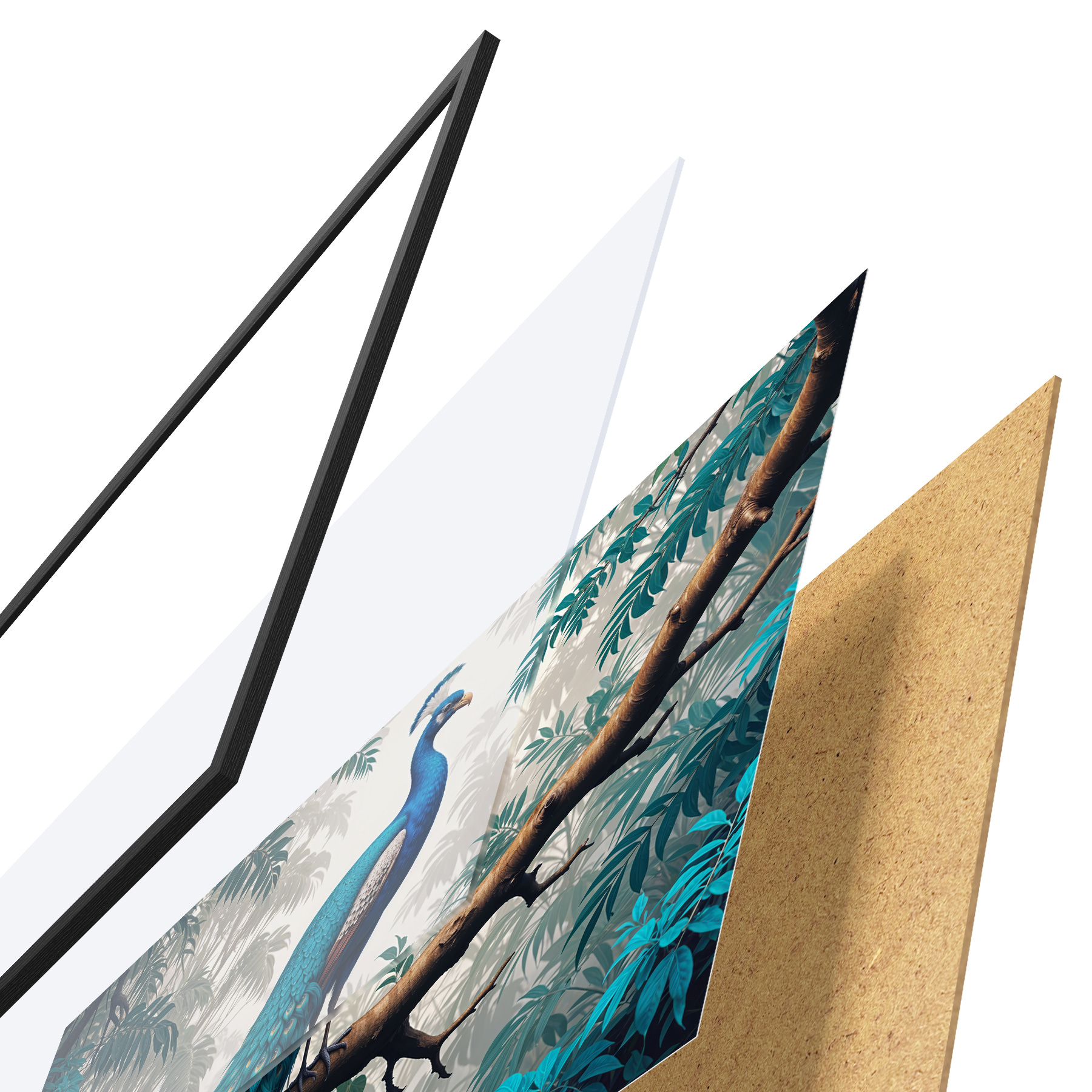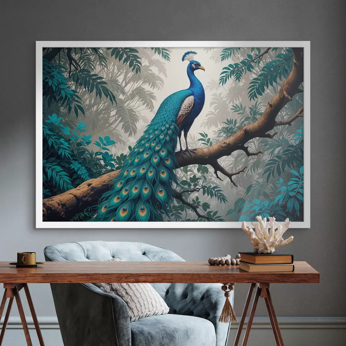 Plakatas Ryškus mėlynas povas, tupintis ant medžio šakos vešliame atogrąžų miške f39401