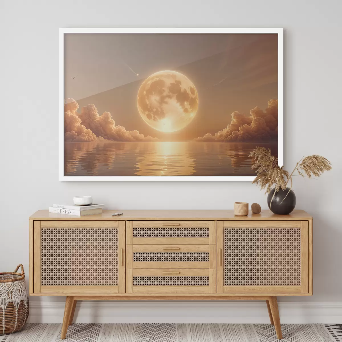 Plakatas Didelis, šviesus pilnatis, kylantis virš ramaus, atspindinčio vandenyno saulėlydžio metu f39403