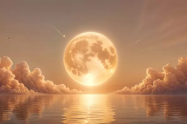 Plakatas Didelis, šviesus pilnatis, kylantis virš ramaus, atspindinčio vandenyno saulėlydžio metu f39403