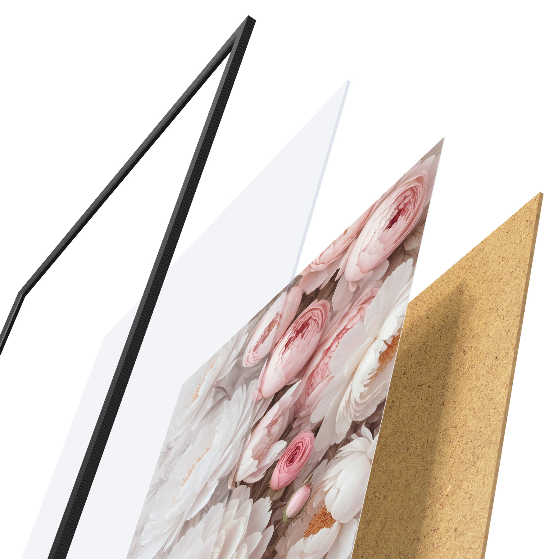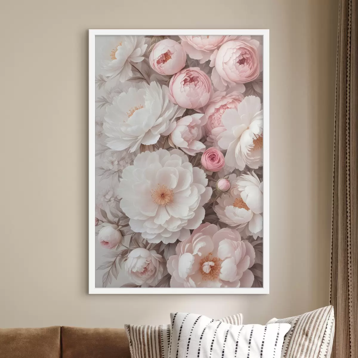 Plakatas Didelių baltų ir rausvų bijūnų gėlių puokštė su švelniais, švelniais žiedlapiais šviesiame fone f39408